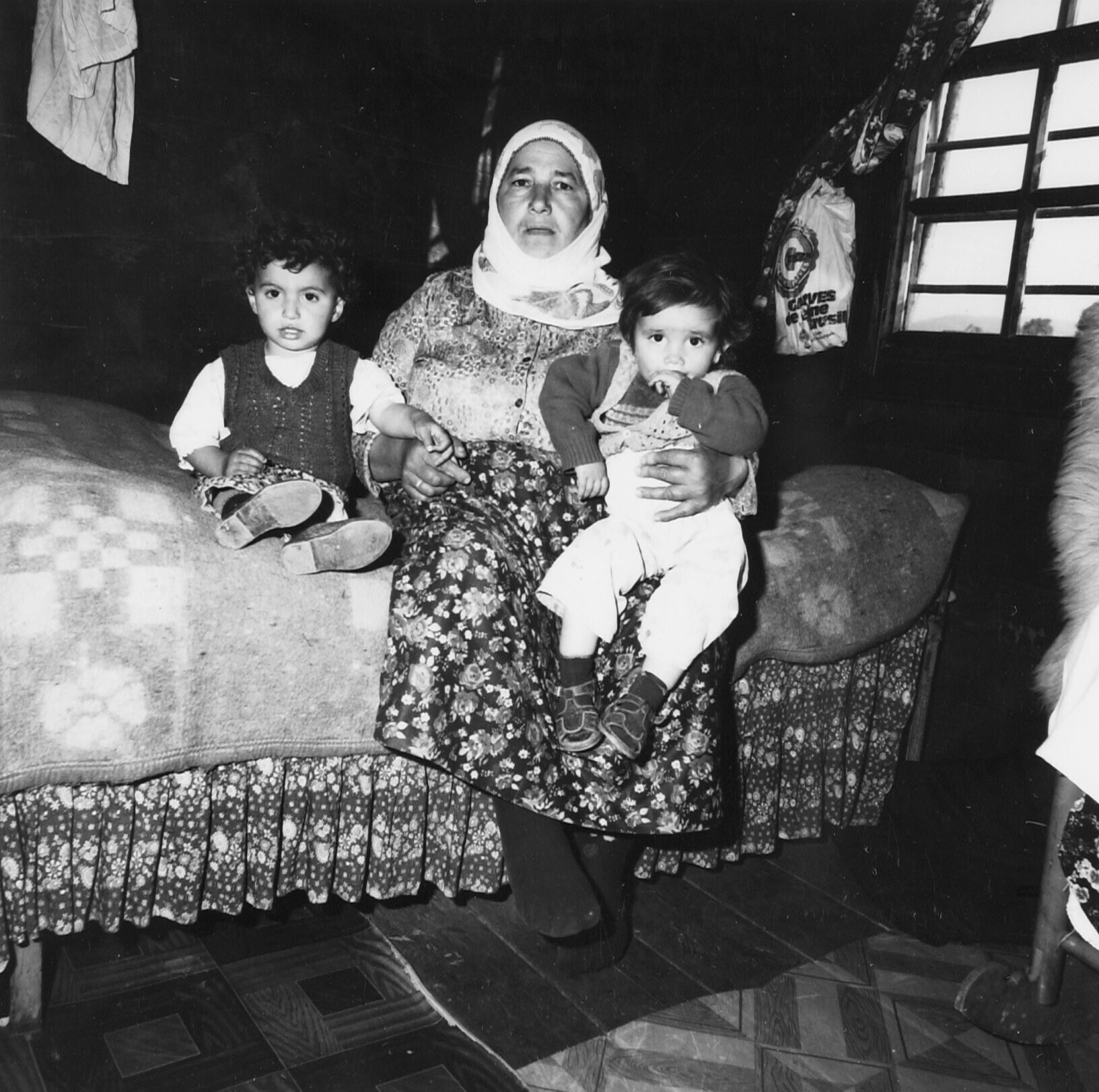 Interieur van een woning, een vrouw met twee kindere...
