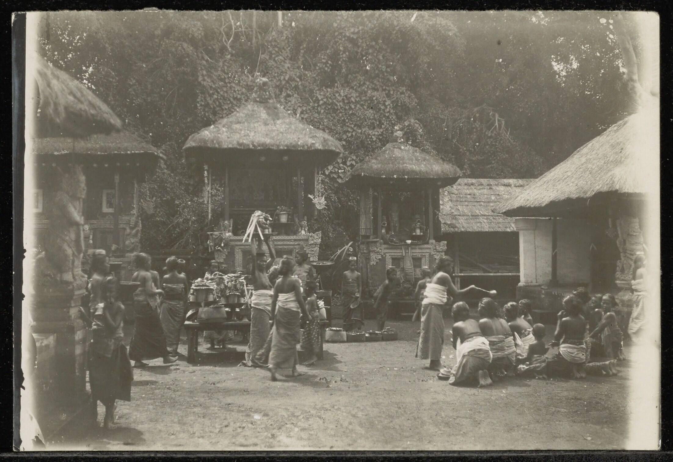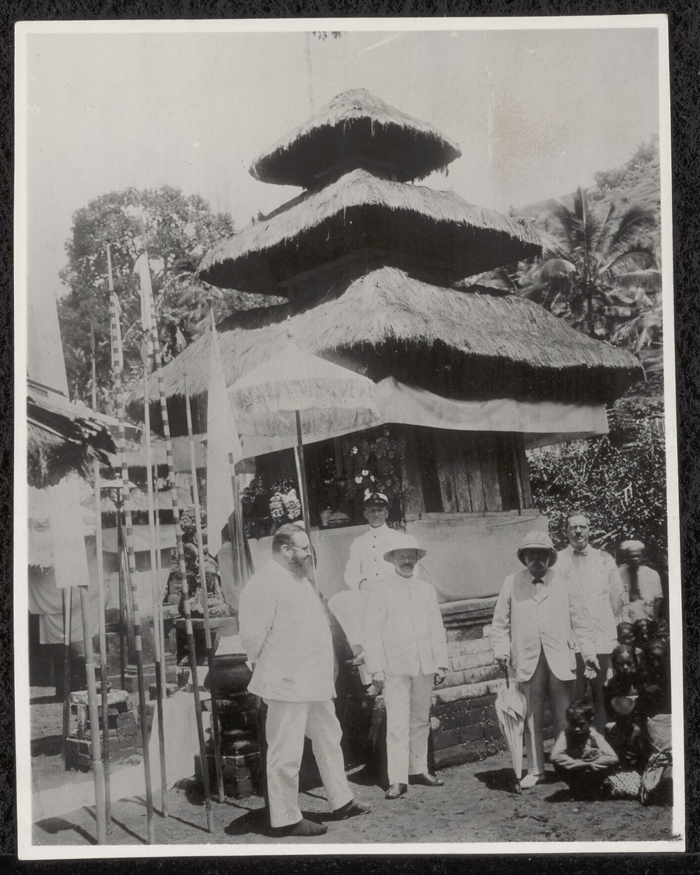 Een groep mensen onder een boom bij een pura (?) op ...