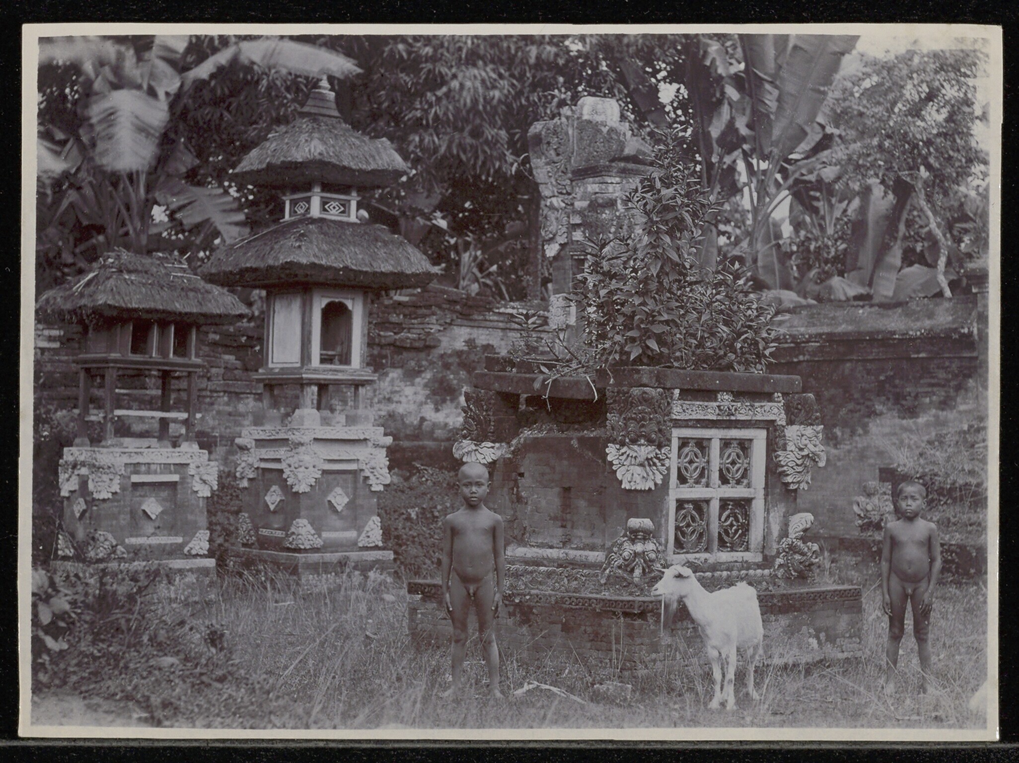 Twee Balinese jongens en een geit bij een godenzetel...