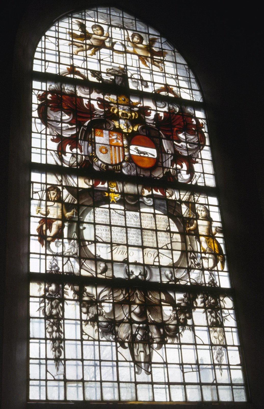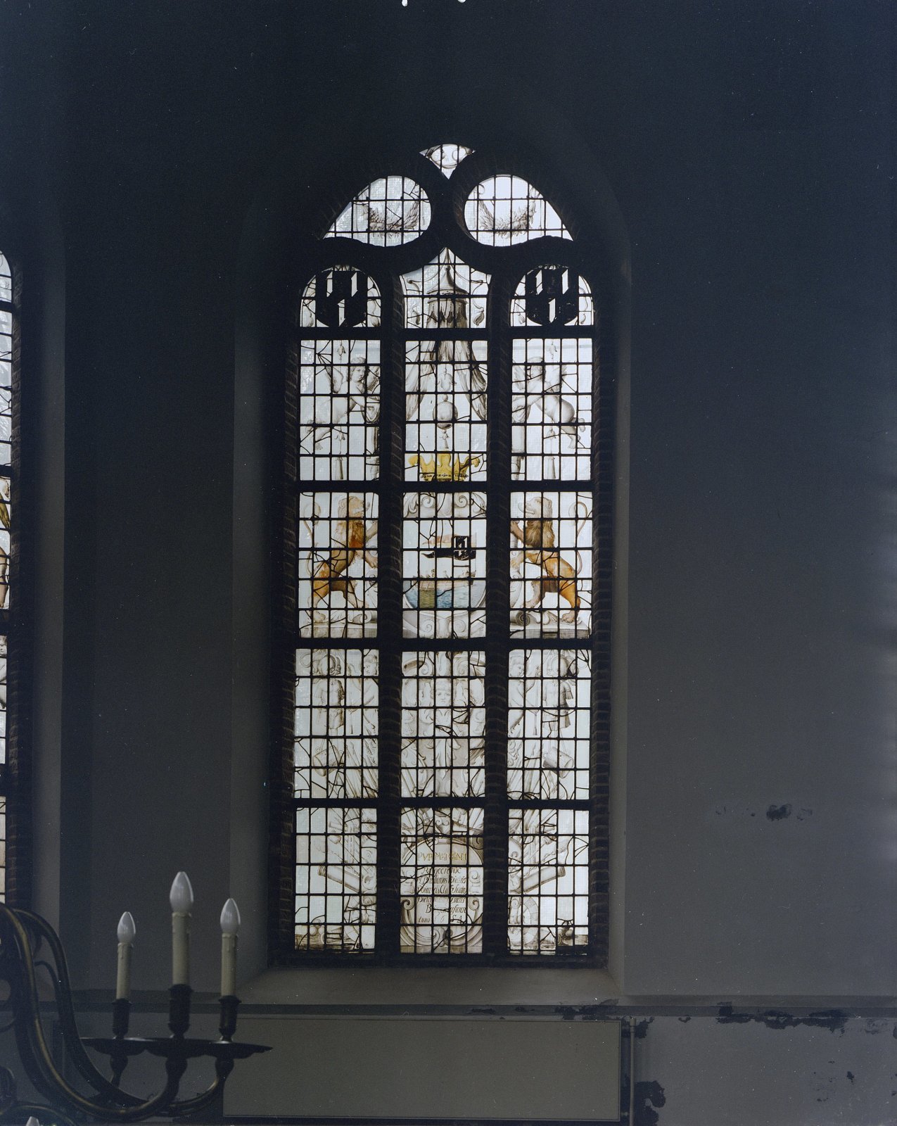 Interieur, gebrandschilderd glas, aan de buitenzijde...