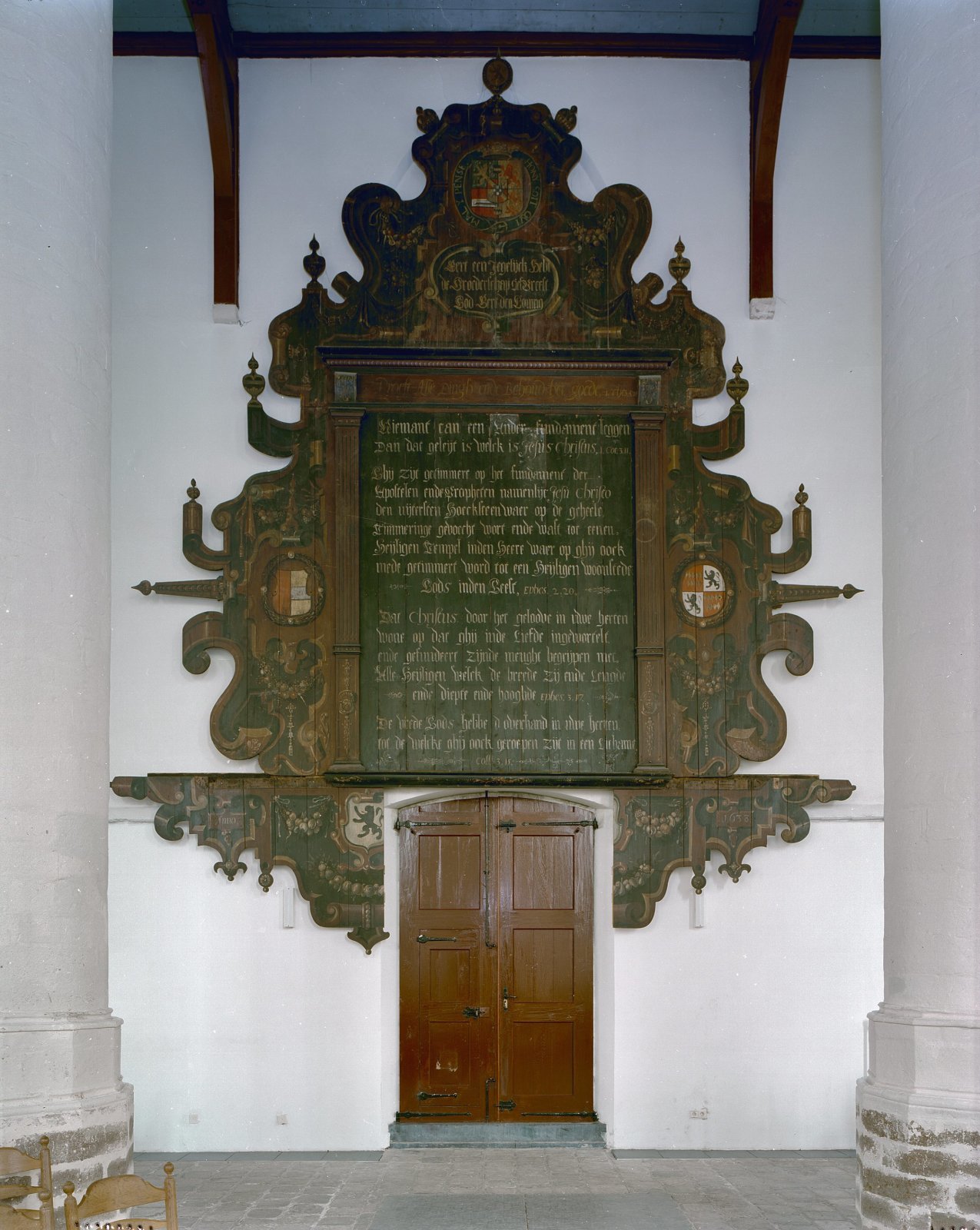 Interieur, tekstbord boven de ingang van het zuider ...