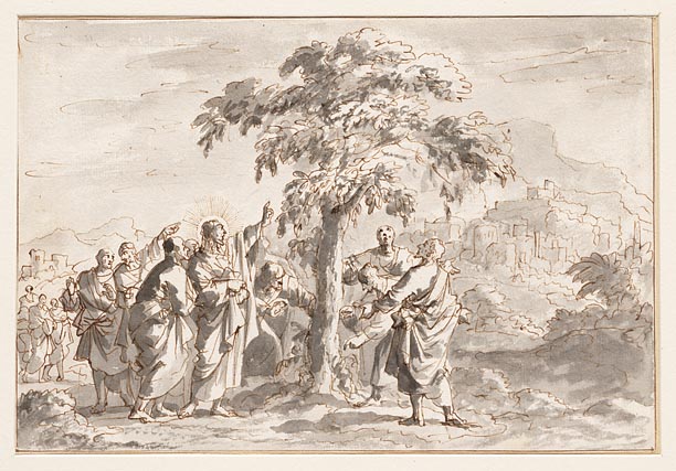 Jezus spreekt Zacheüs aan die in de vijgenboom is ge...