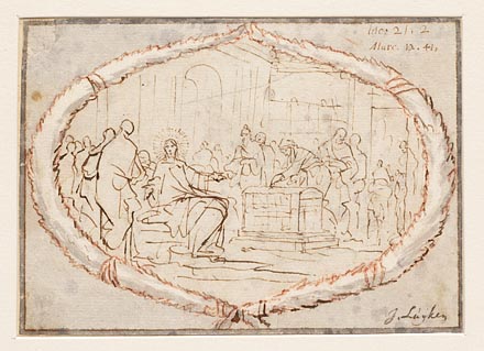 Jezus wijst de omstanders op de offerkist waarin de ...