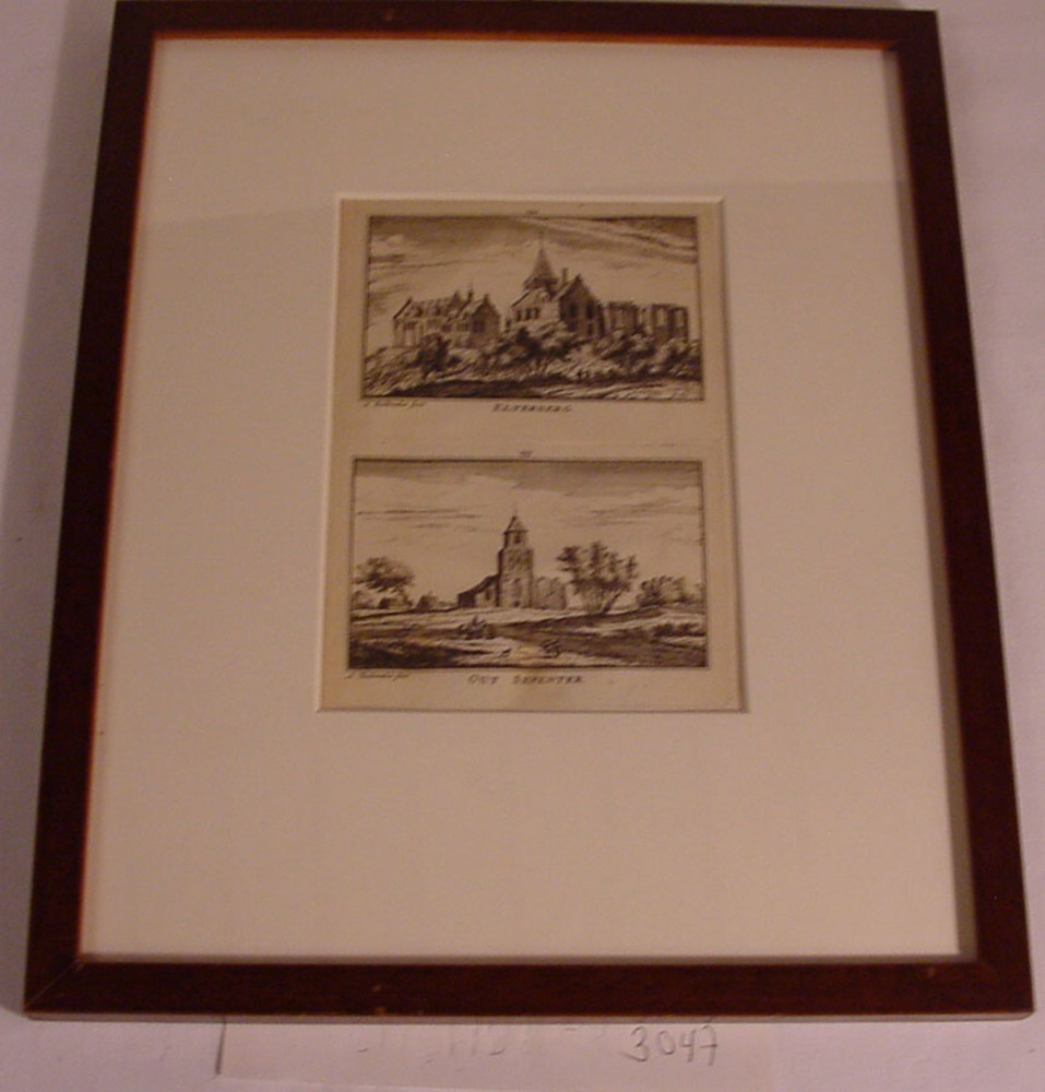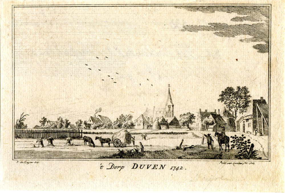 Prent ‘t Dorp Duven 1742' op papier, naar een tekeni...