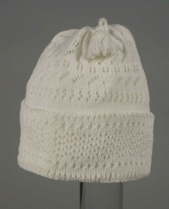 Babymuts gebreid van fijn wit katoen in ajoursteek m...