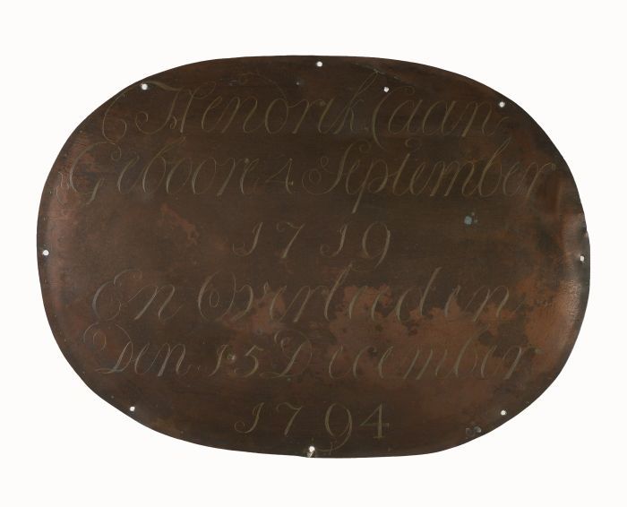 Ovalen koperen grafplaat of kistplaat van "Hendrik C...