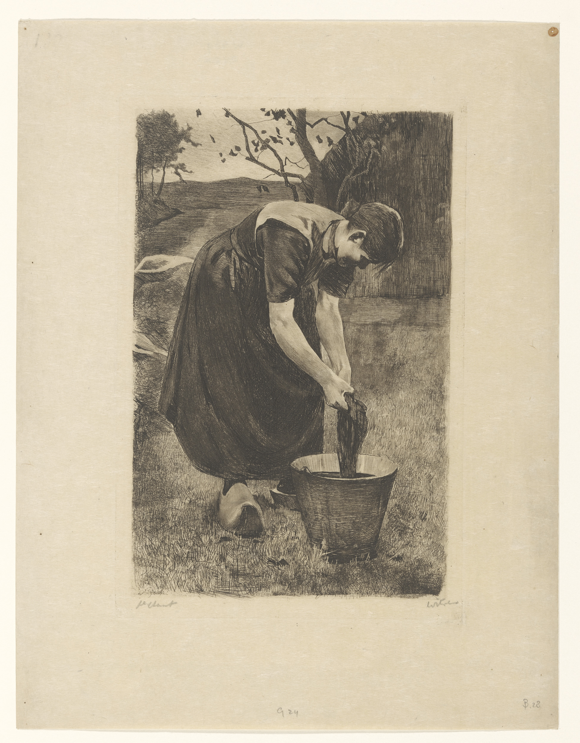 Boerin wast textiel in een emmer