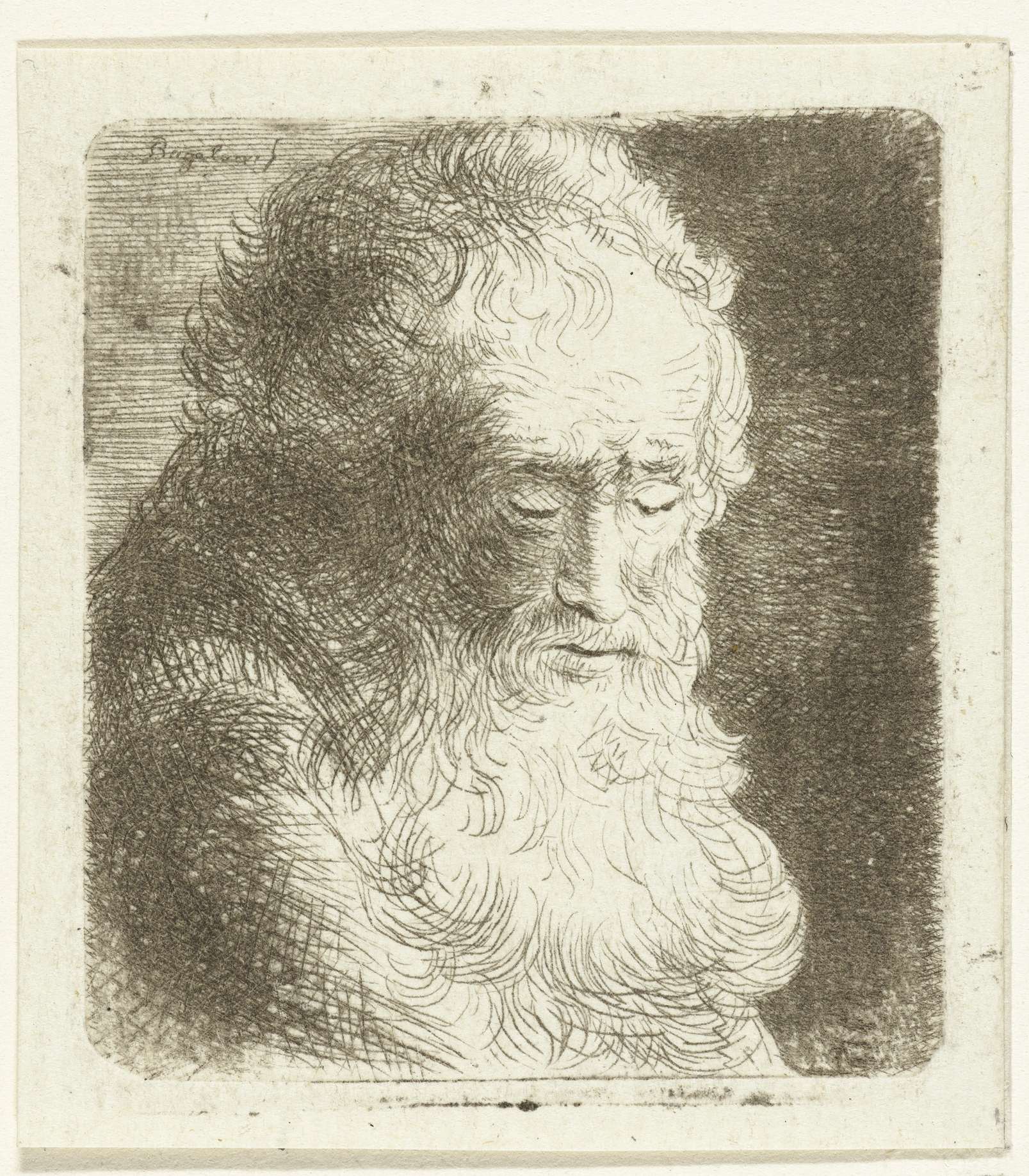 Oude man met baard met de blik naar beneden gericht:...