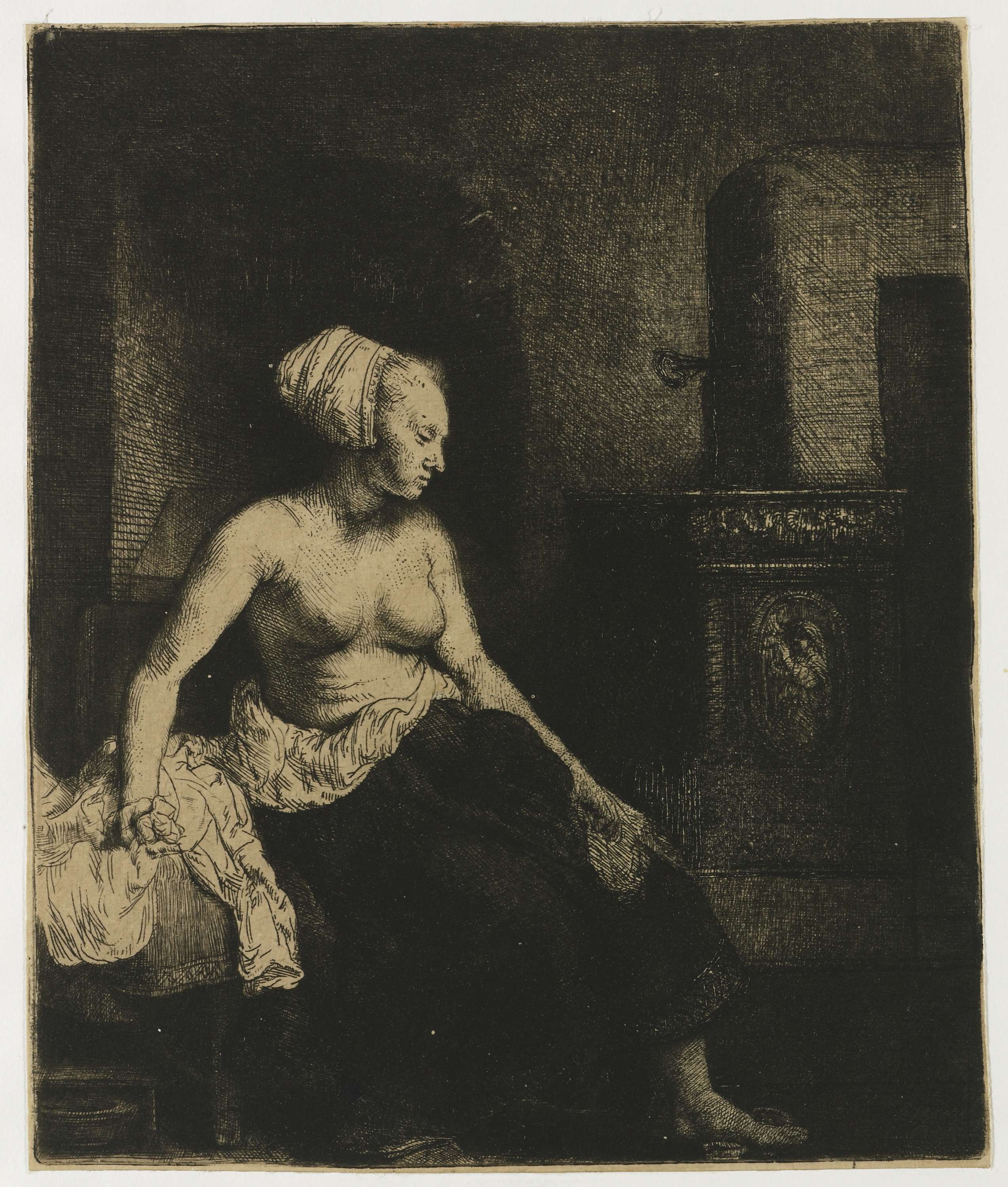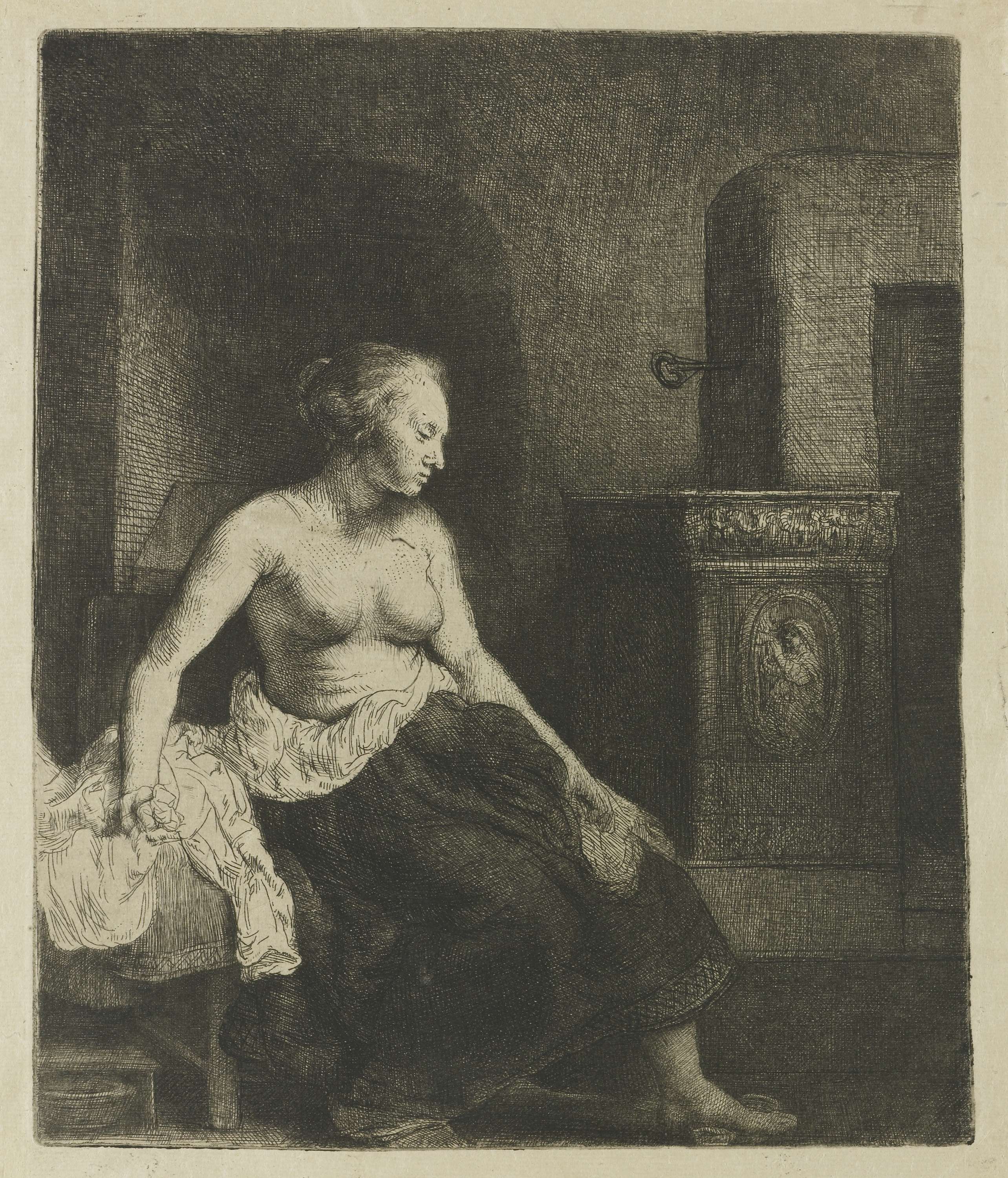 Vrouw zittend met ontbloot bovenlichaam bij een kachel
