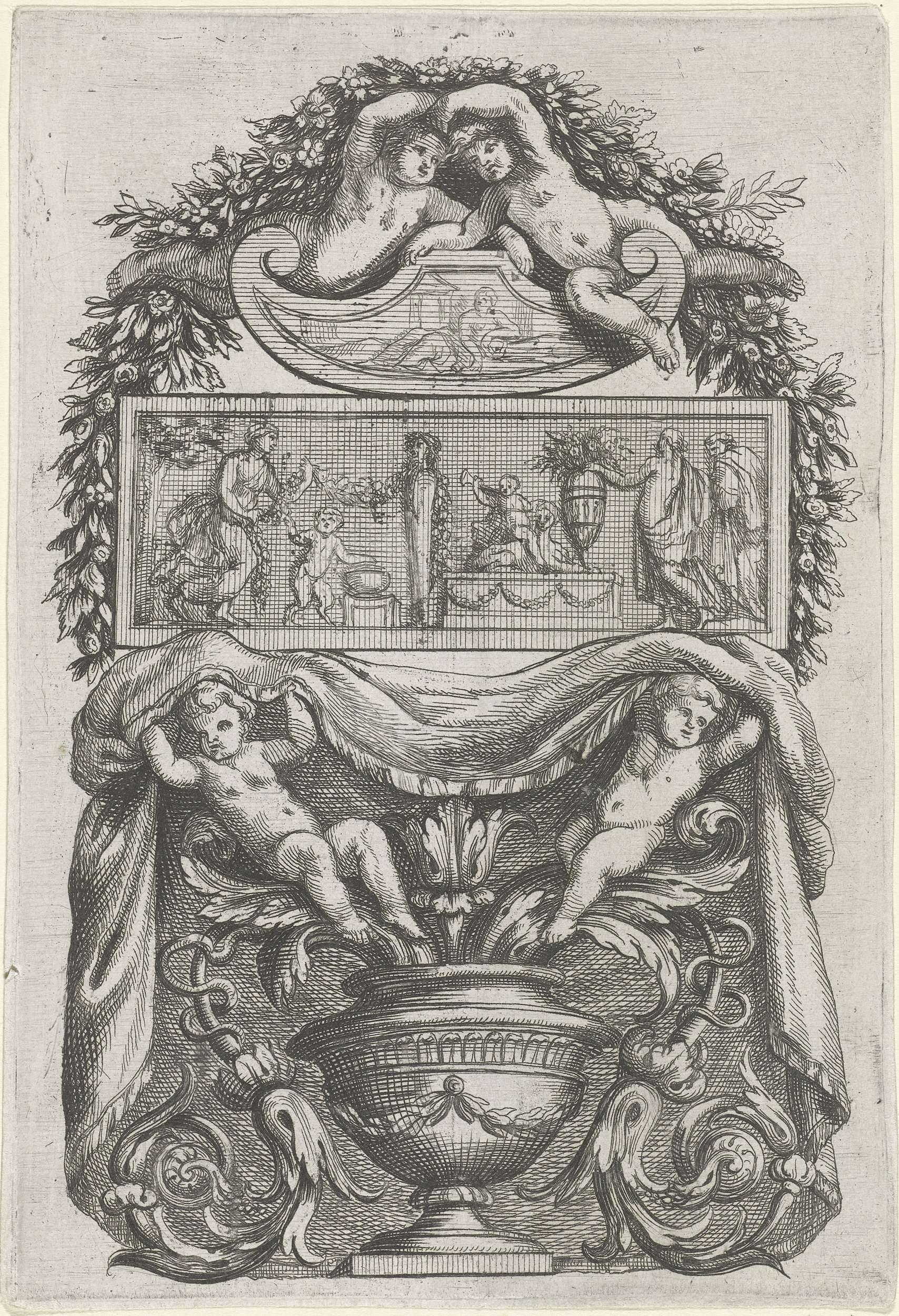 Plaat met reliëf tussen schild en vaas