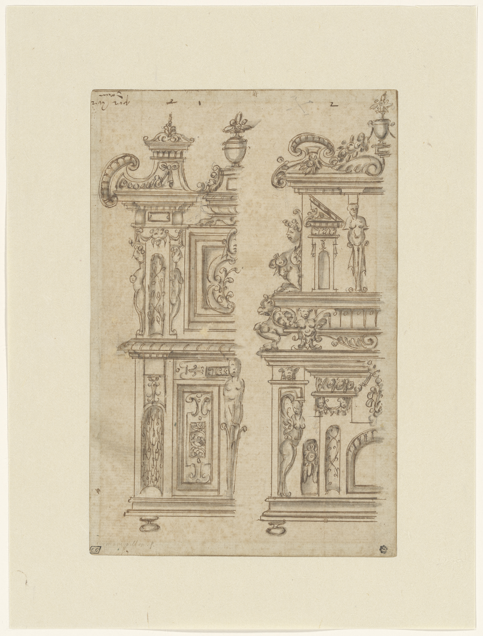 Ontwerp voor twee gebeeldhouwde kabinetten (van beid...