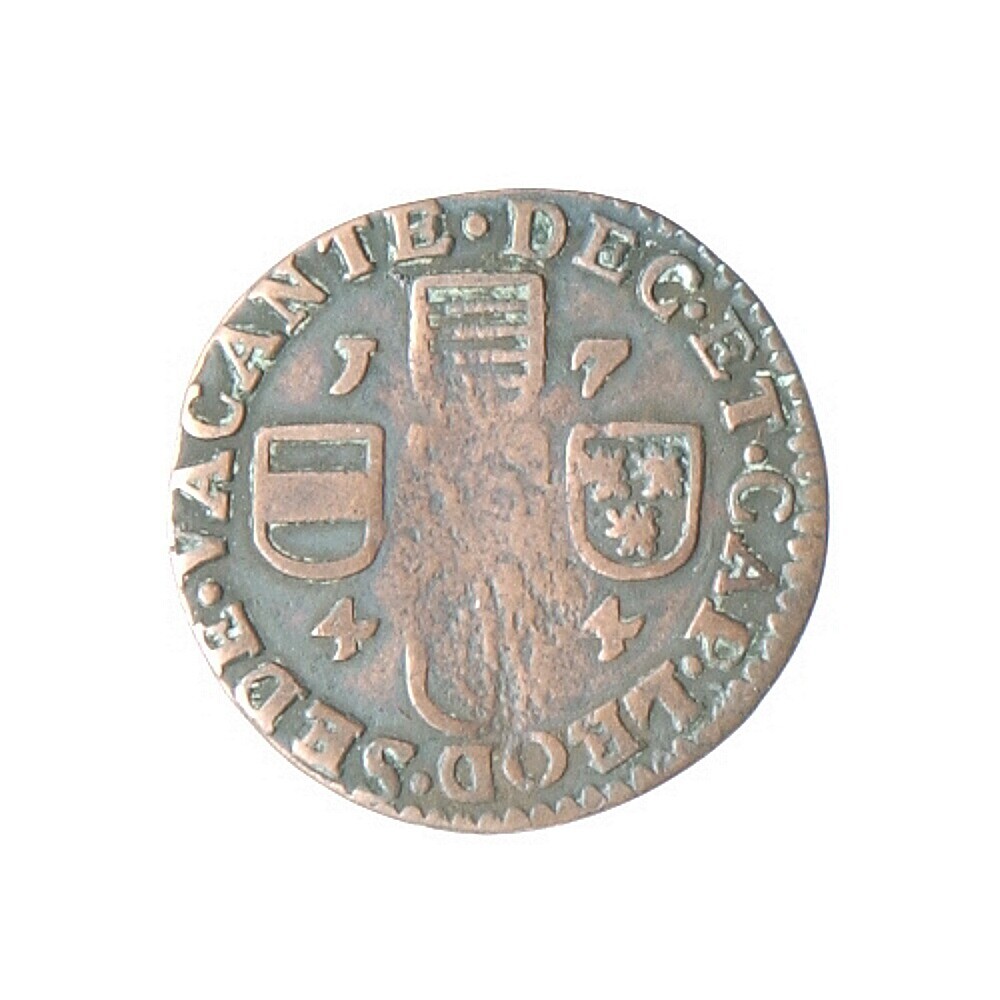 Koperen munt met kop van S. Lambertus