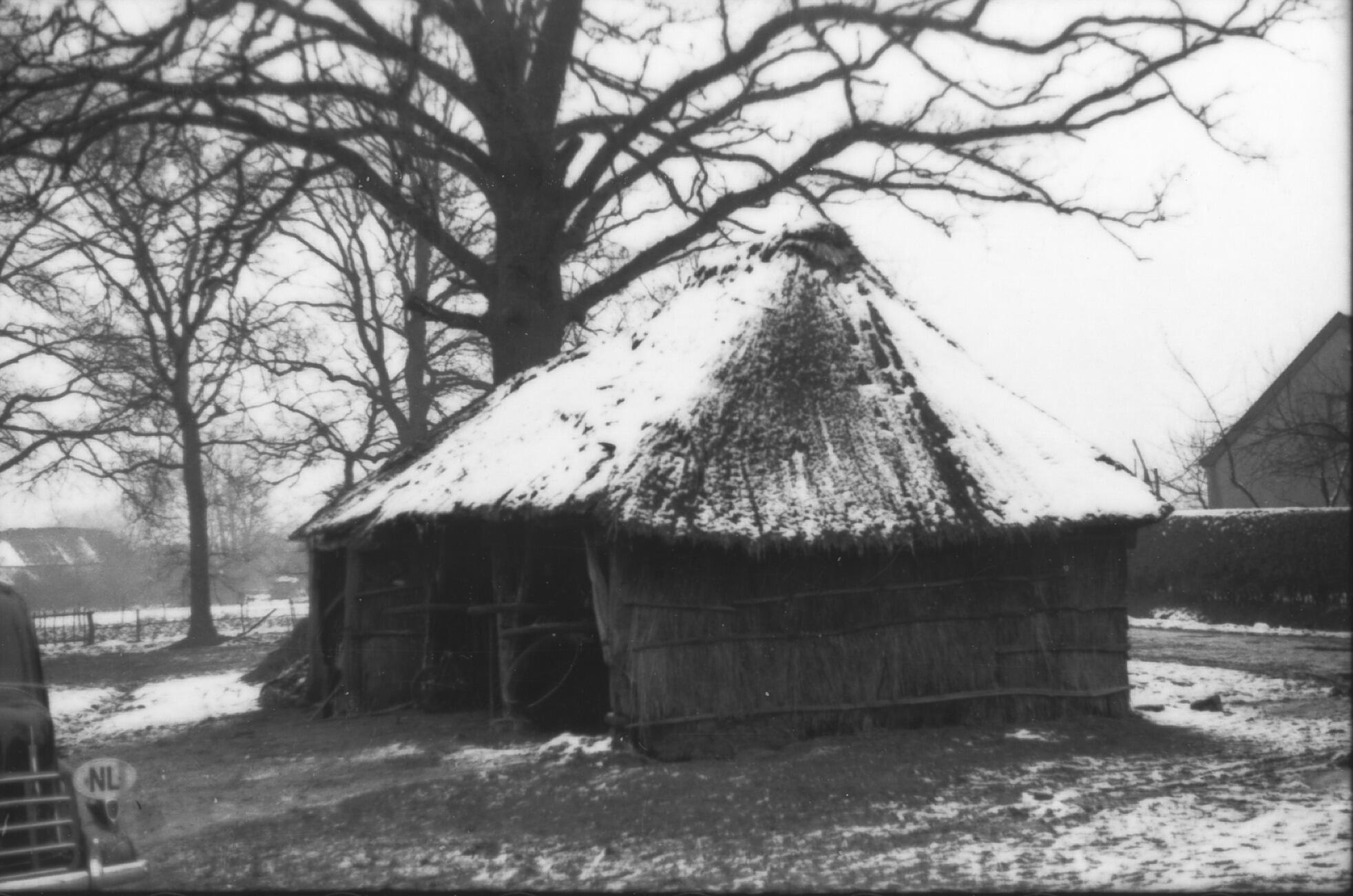 Besneeuwde schuur, Borkel, 1937 (zwart-wit foto)
