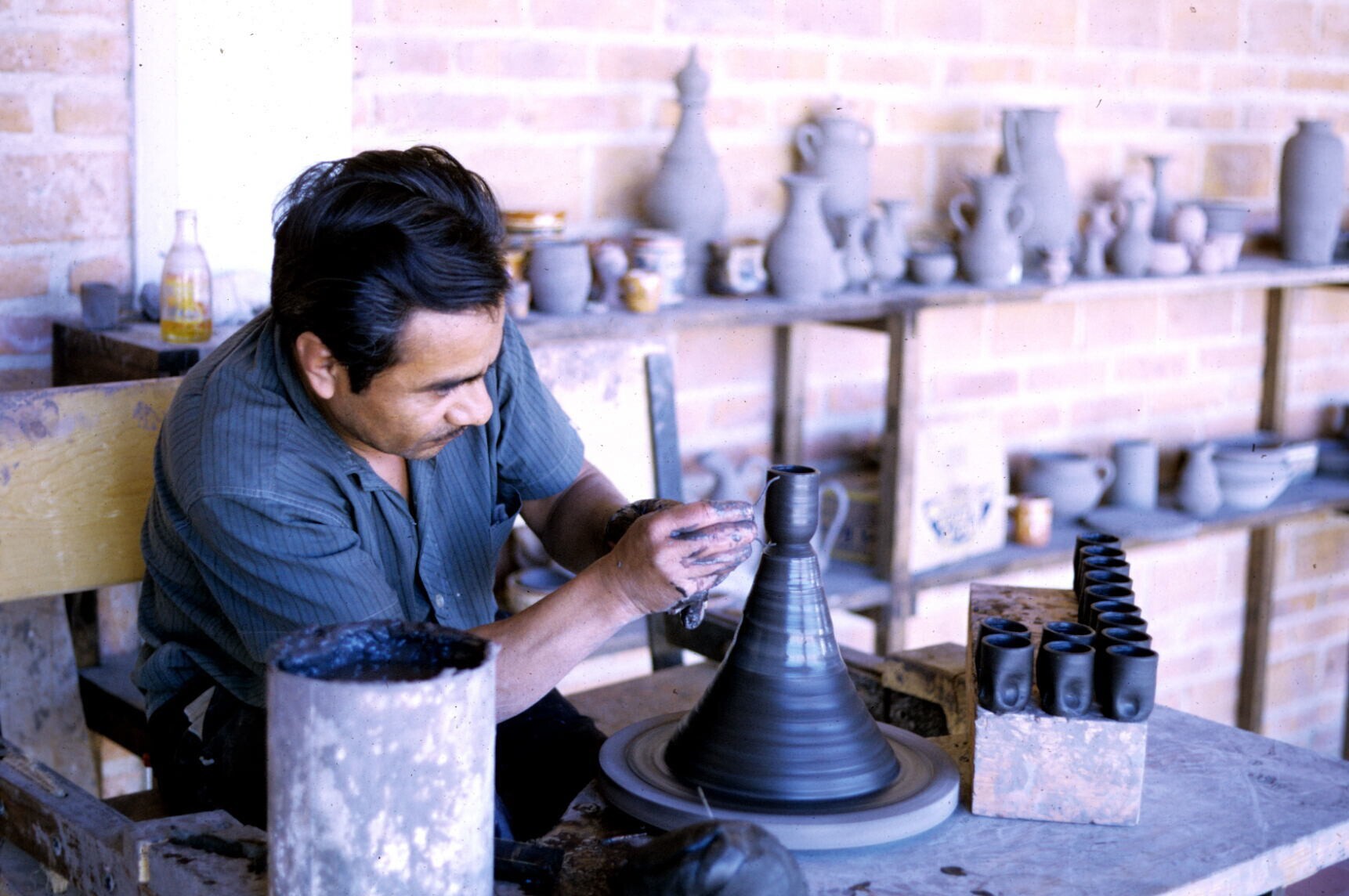 pottenbakker in atelier van Amado Galván met mallen ...