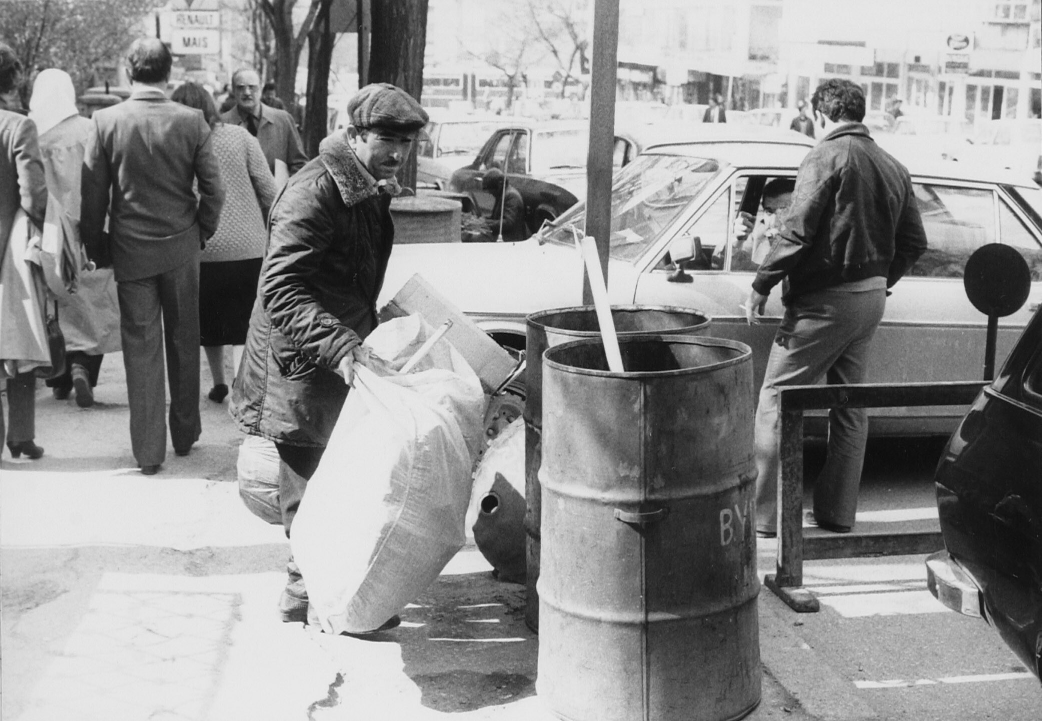 Straatbeeld, man op zoek naar bruikbare spullen in v...