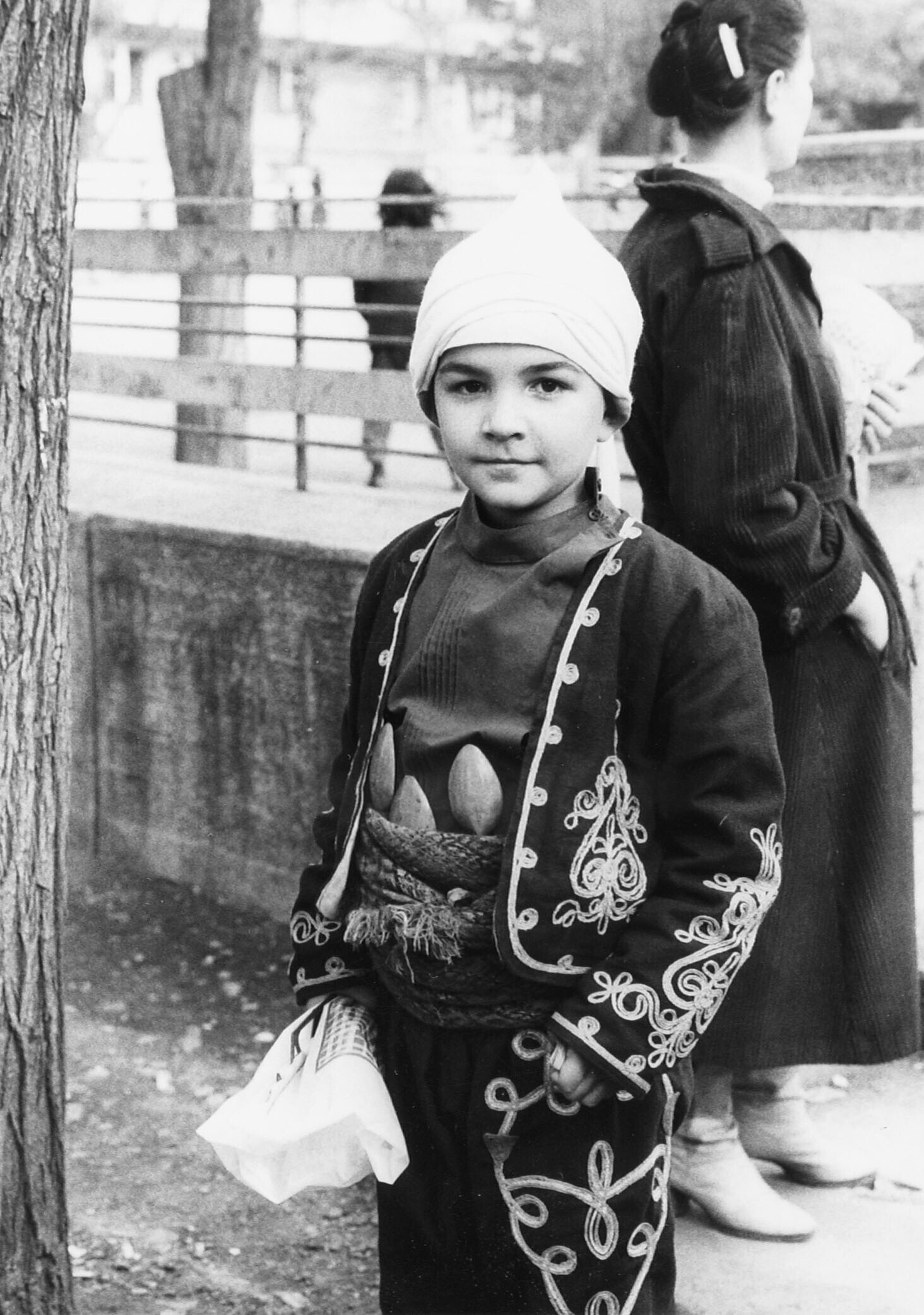 Op een schoolplein, jongetje in traditioneel kostuum...