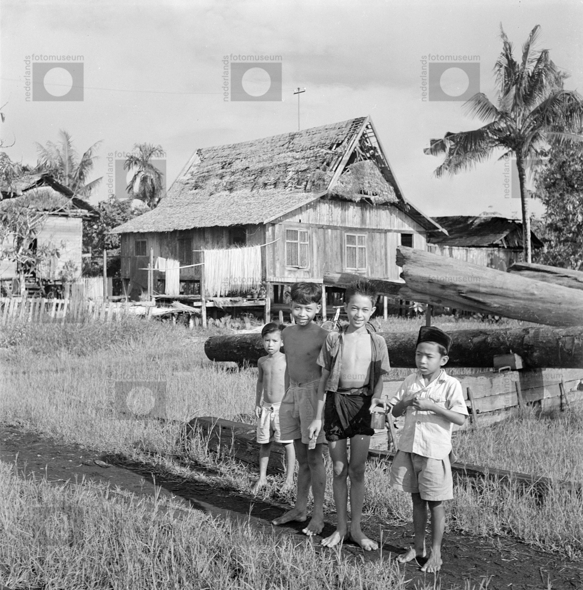 Vier jongens poseren voor een inheemse paalwoning, I...
