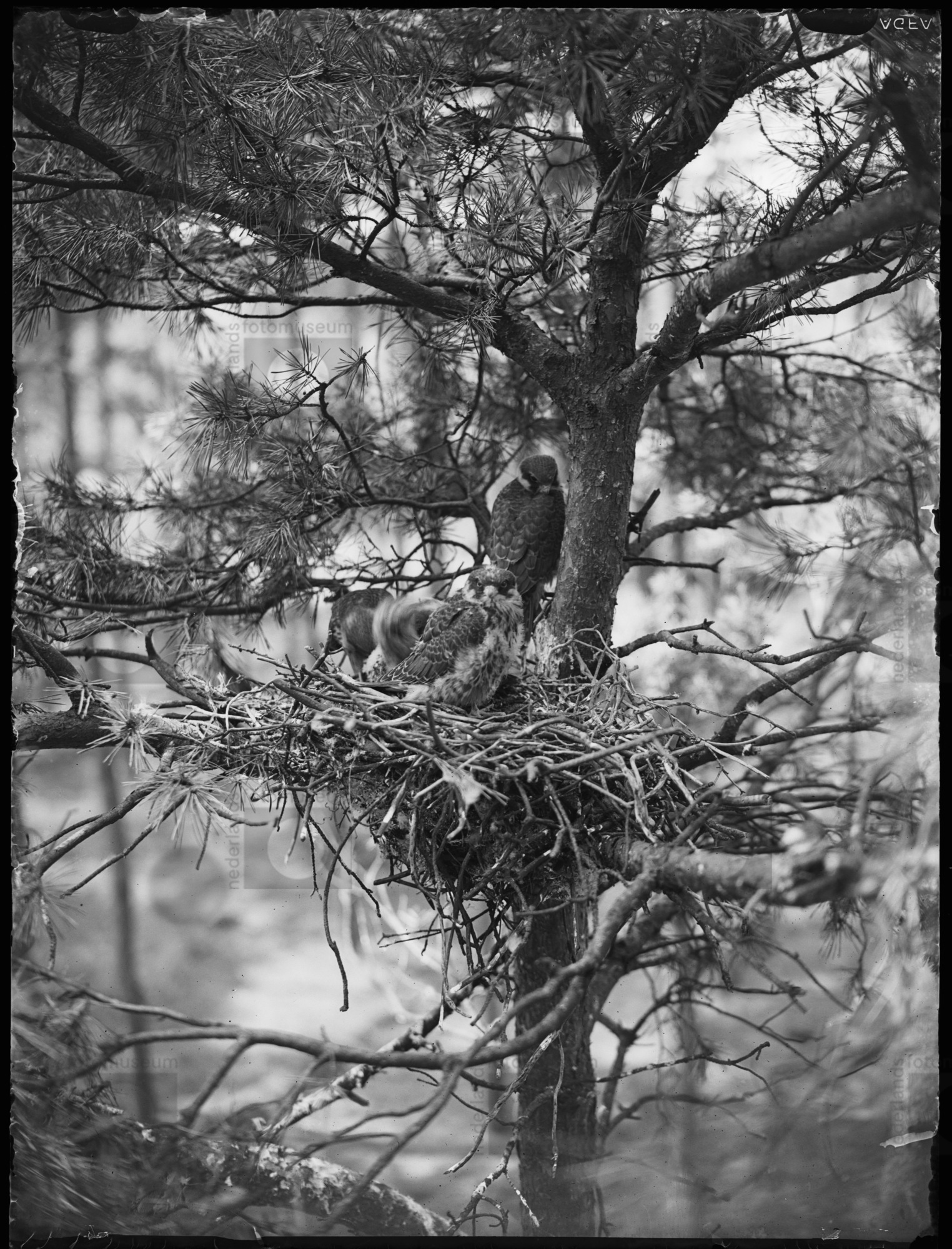 Gaai bij nest met jongen, Ugchelen (1934)
