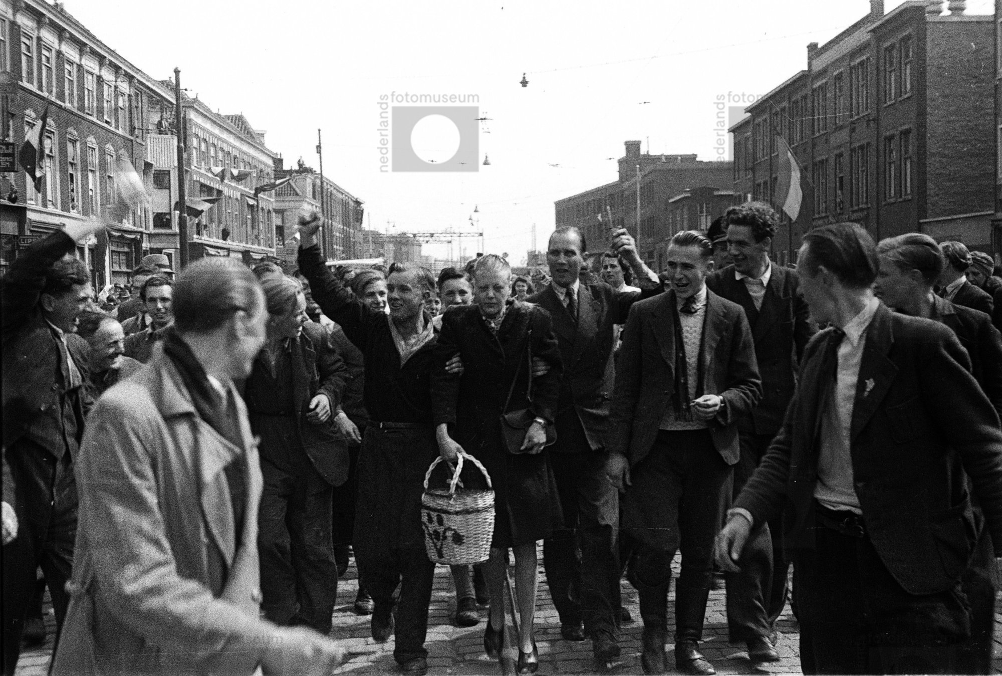 Een juichende menigte leidt een nazi-gezinde vrouw d...