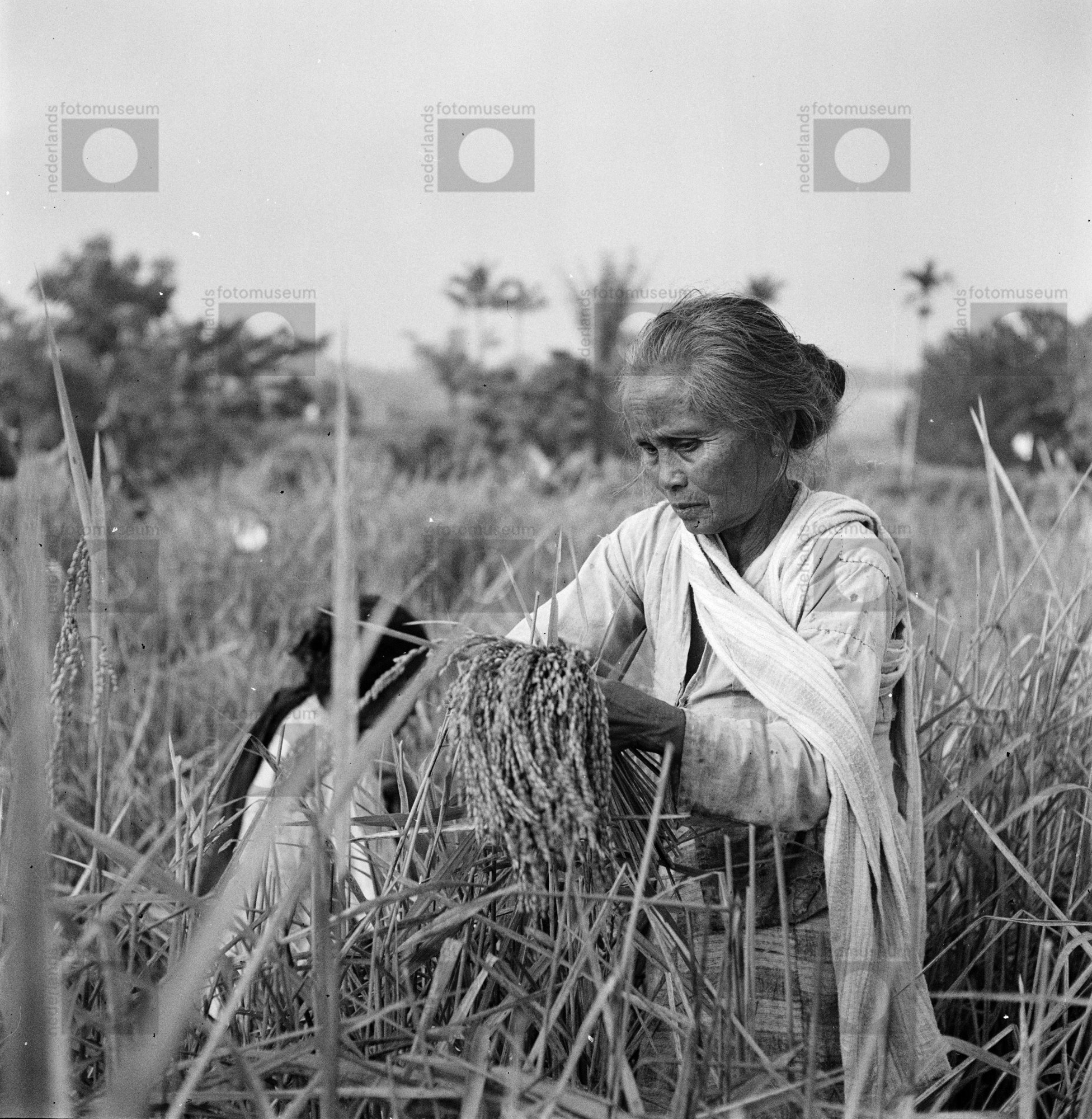 Een vrouw oogst rijst in een moerasrijstveld (sawa),...