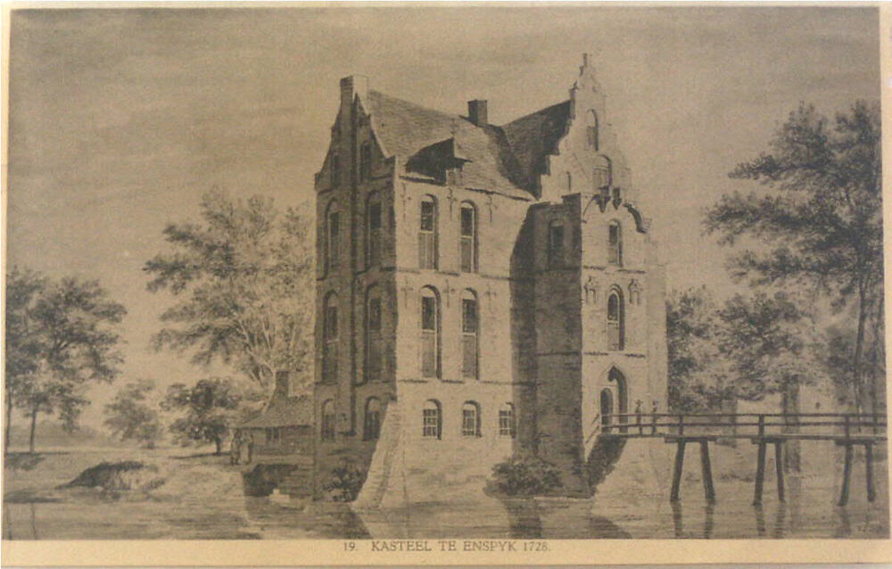 Reproductieprent, voorstellende het kasteel te Enspi...