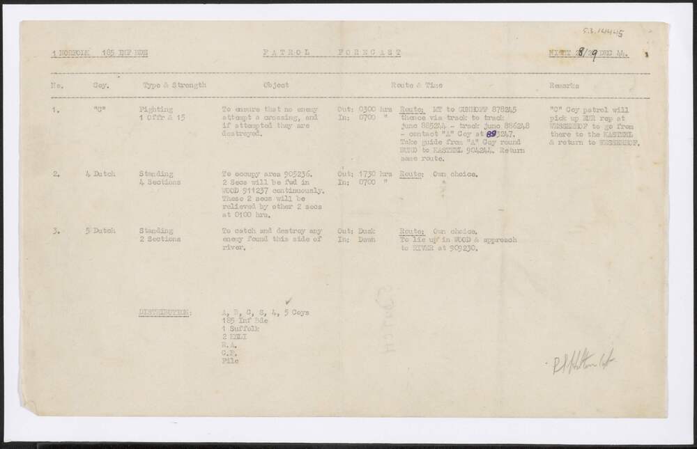 Patrol forecast, 1 Norfolk, 185 Inf Bde, Night 28/29...