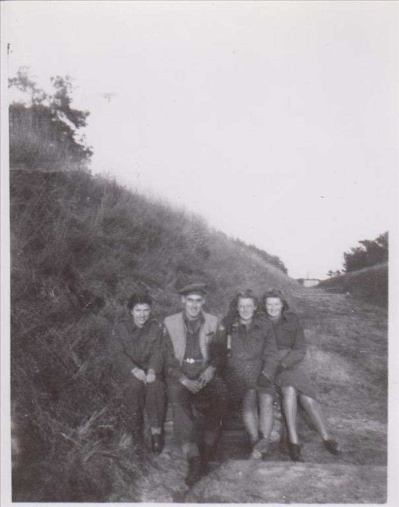 Foto van drie vrouwen en een man in uniform zittend ...