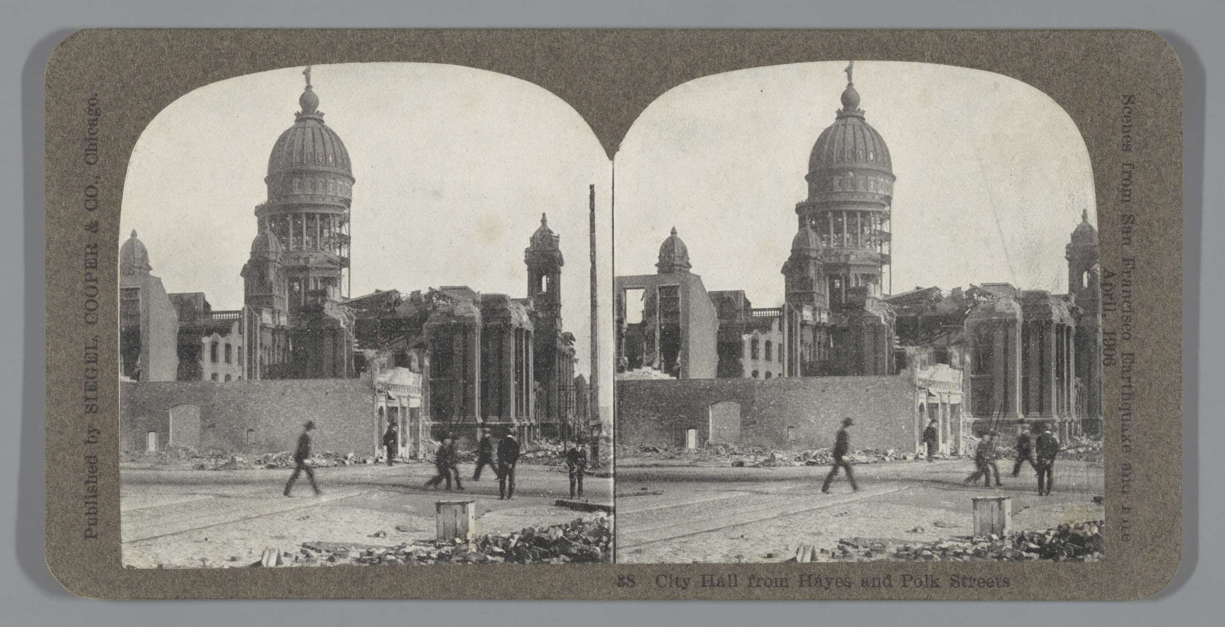 Gezicht op een verwoest stadhuis na de aardbeving in...