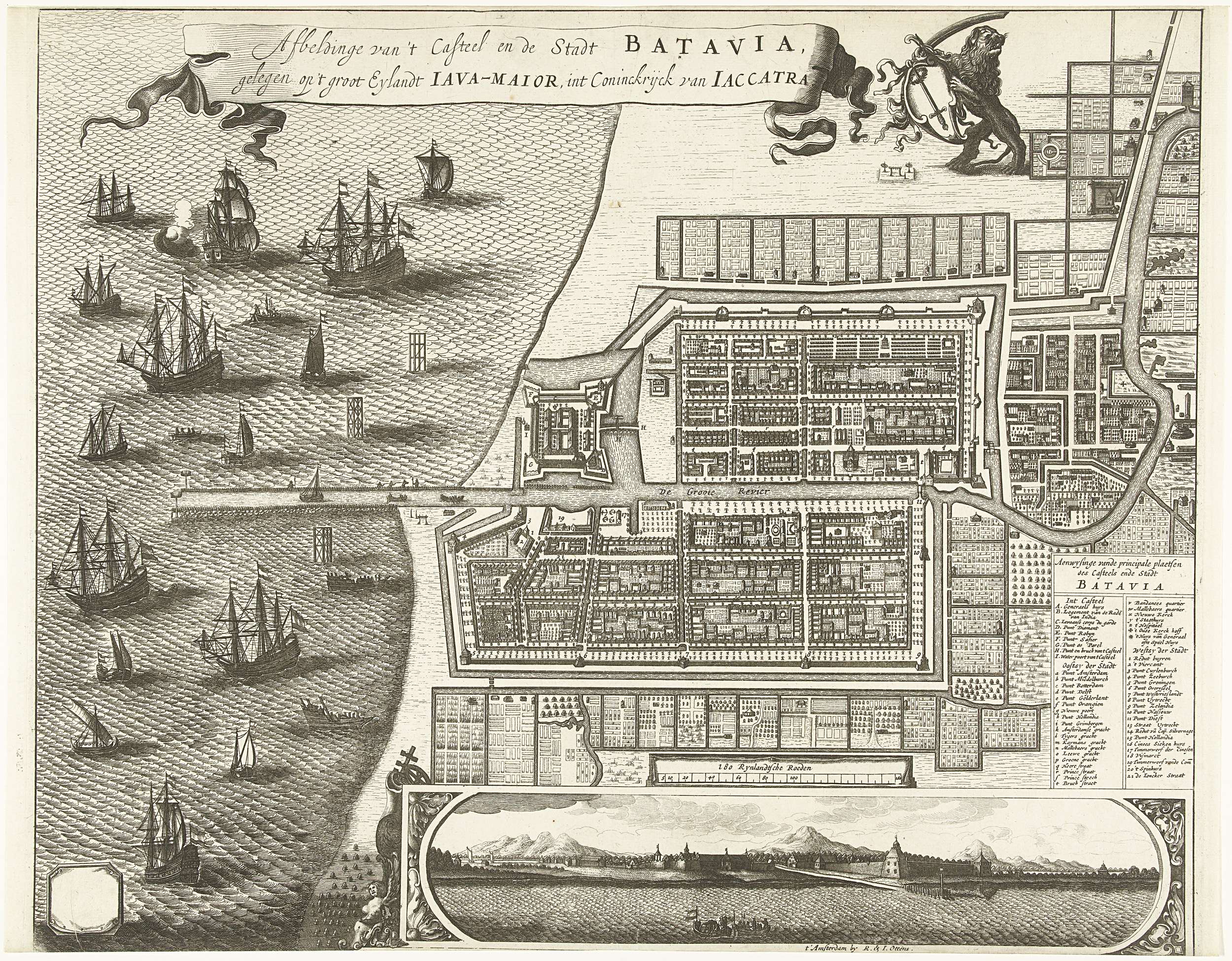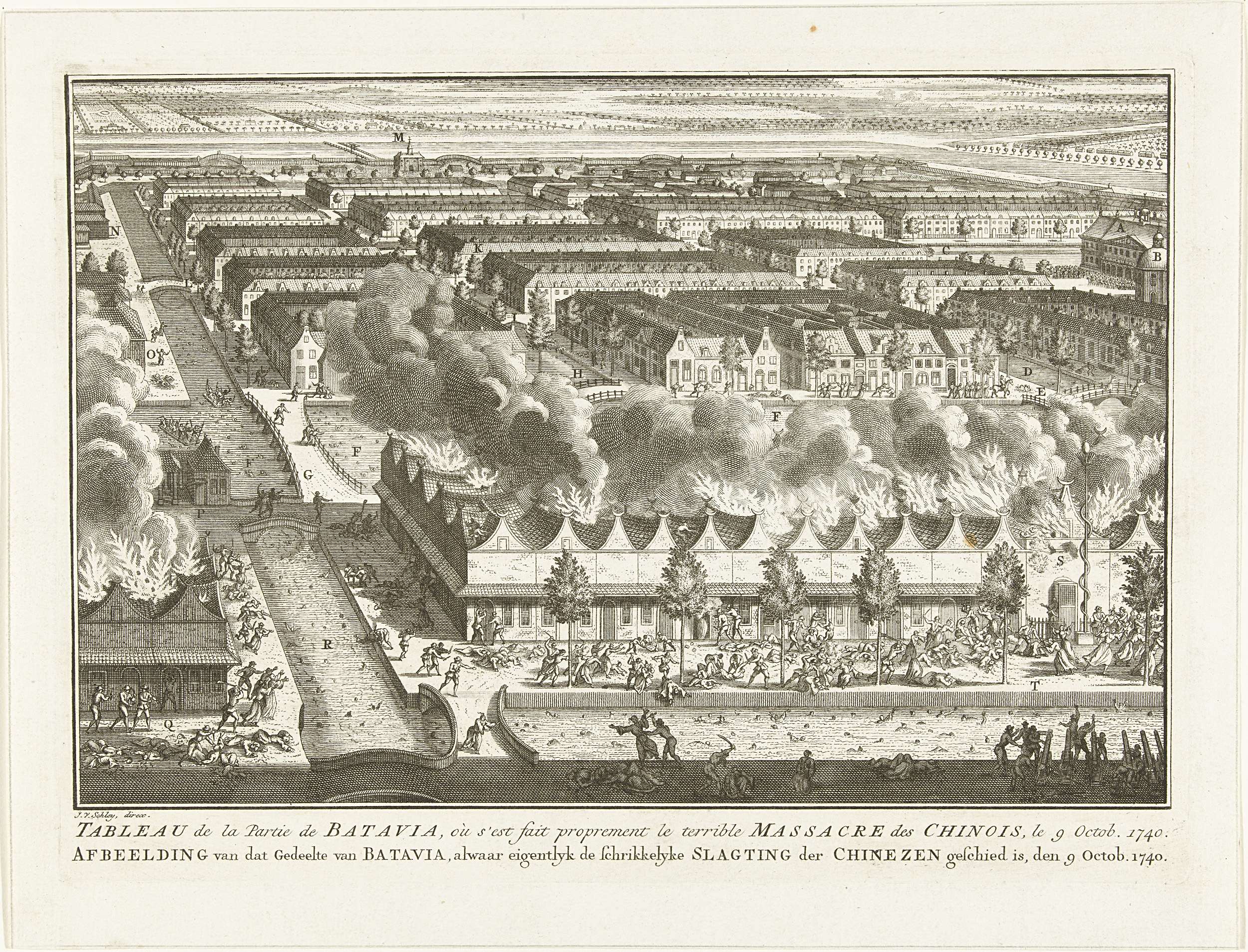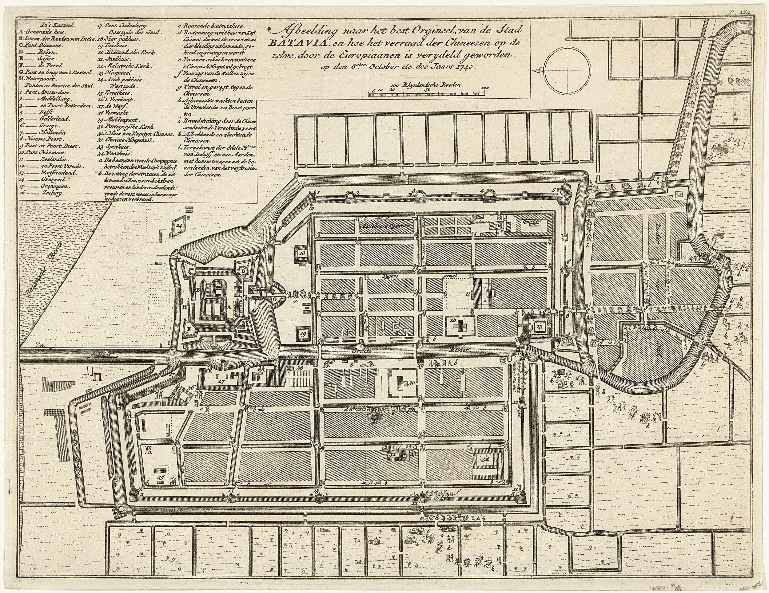 Plattegrond van Batavia met de moord op Chinezen, 1740