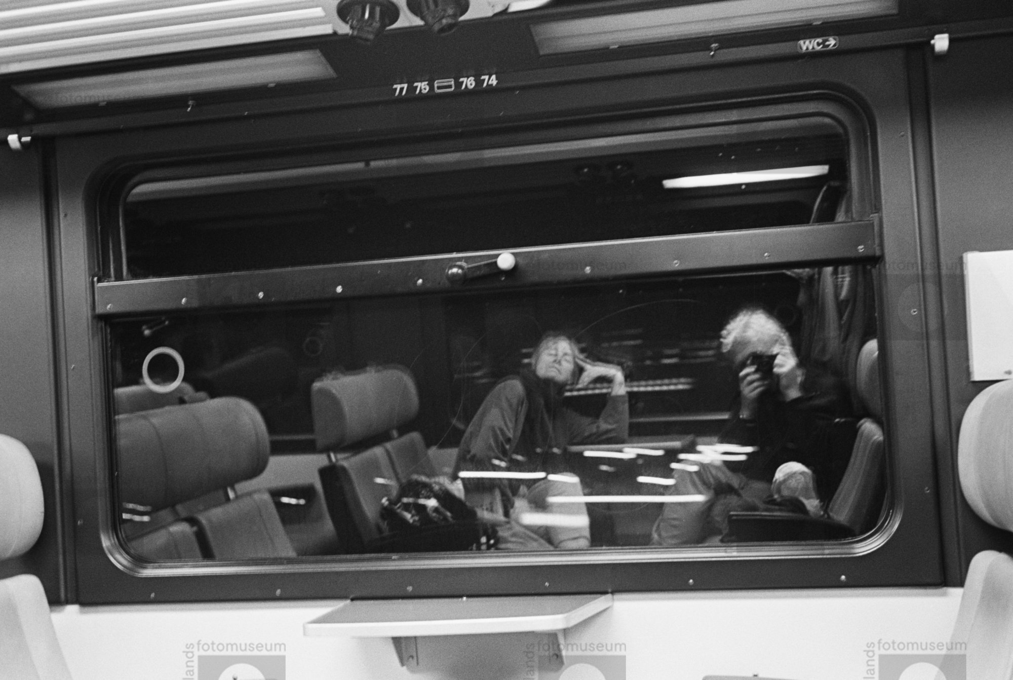 Kors en Ine 's avonds in de trein. Weerspiegelin...