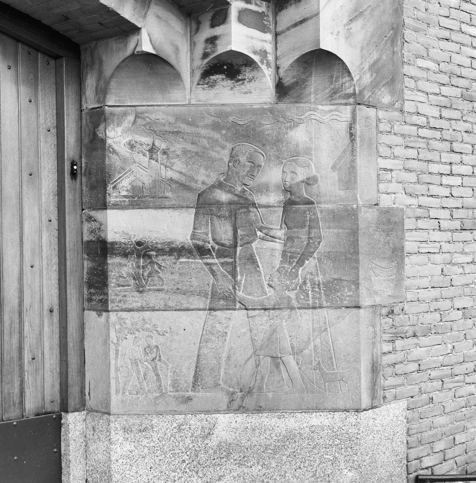 Hoofdgebouw, ingang, reliëf van Mari Andriessen