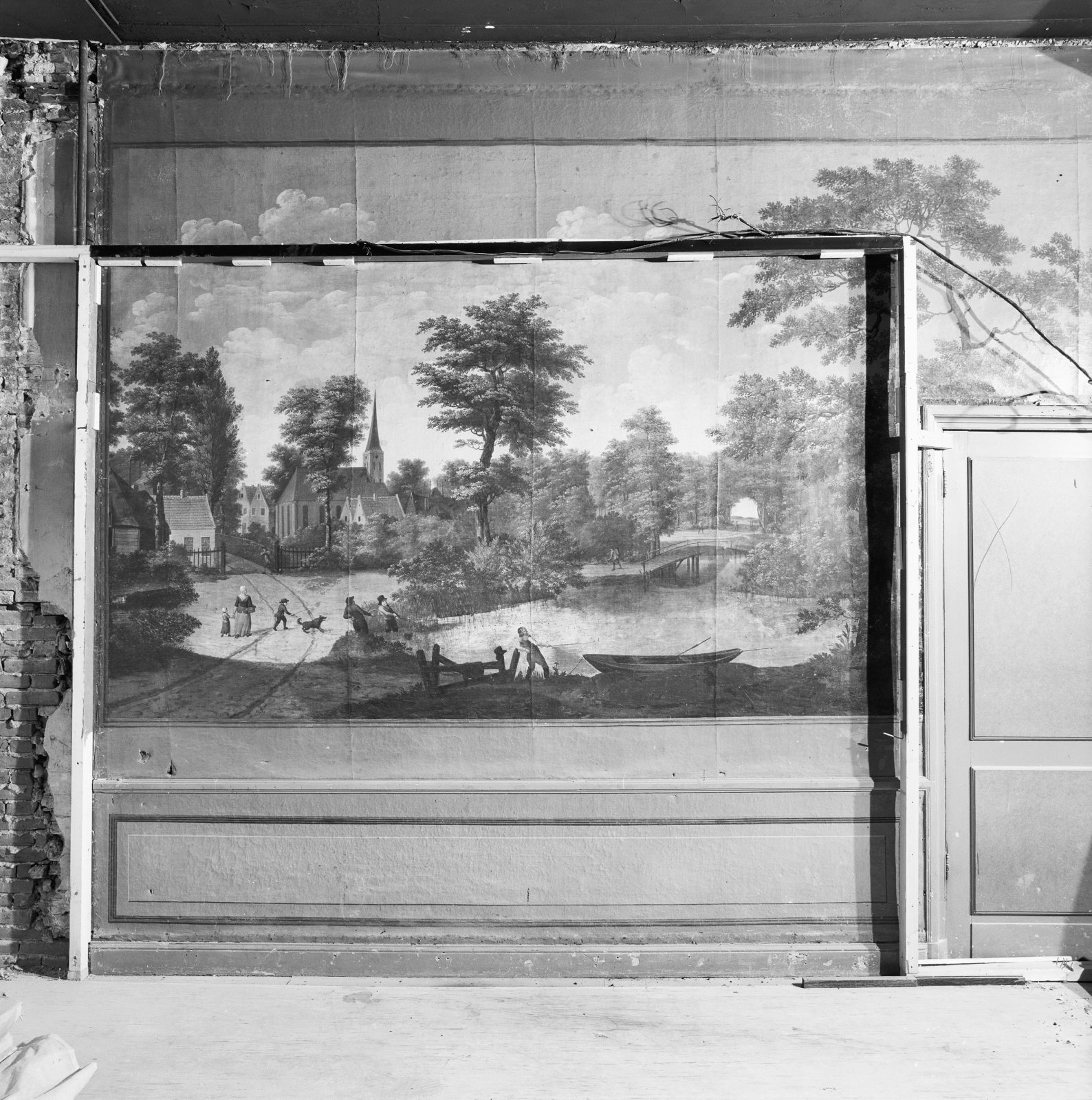 Interieur, detail geschilderd behangsel