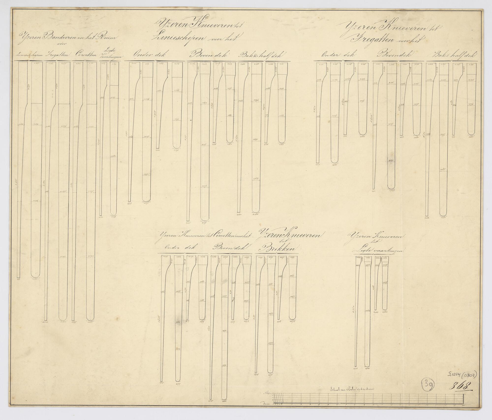 Maattekening van de ijzeren knieveren van linieschep...