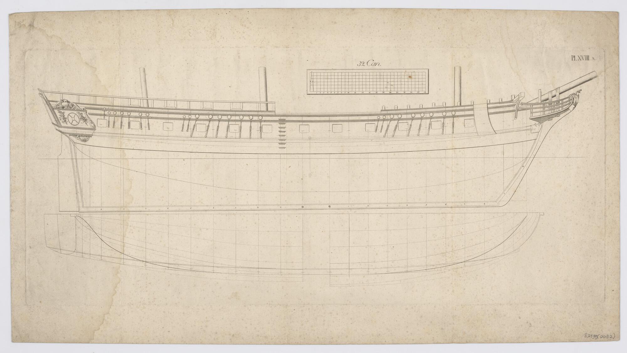 Lijnenplan van een oorlogsschip van 32 stukken