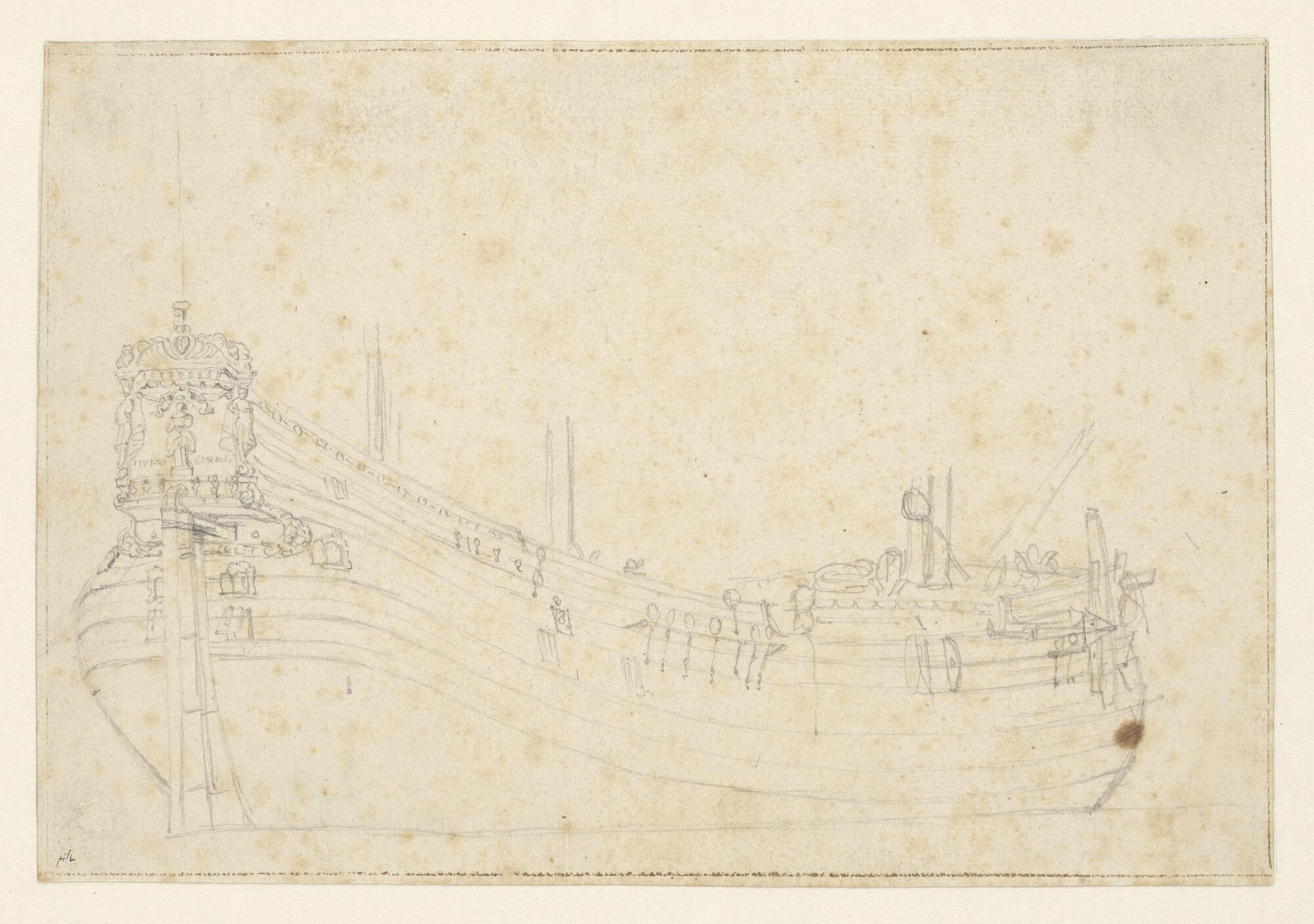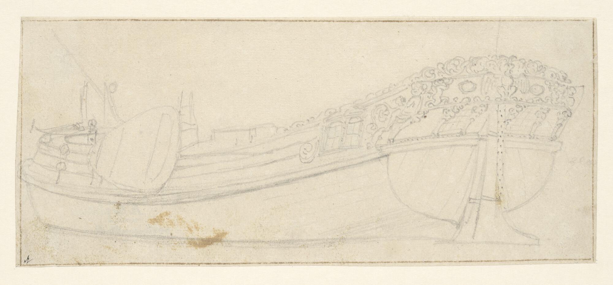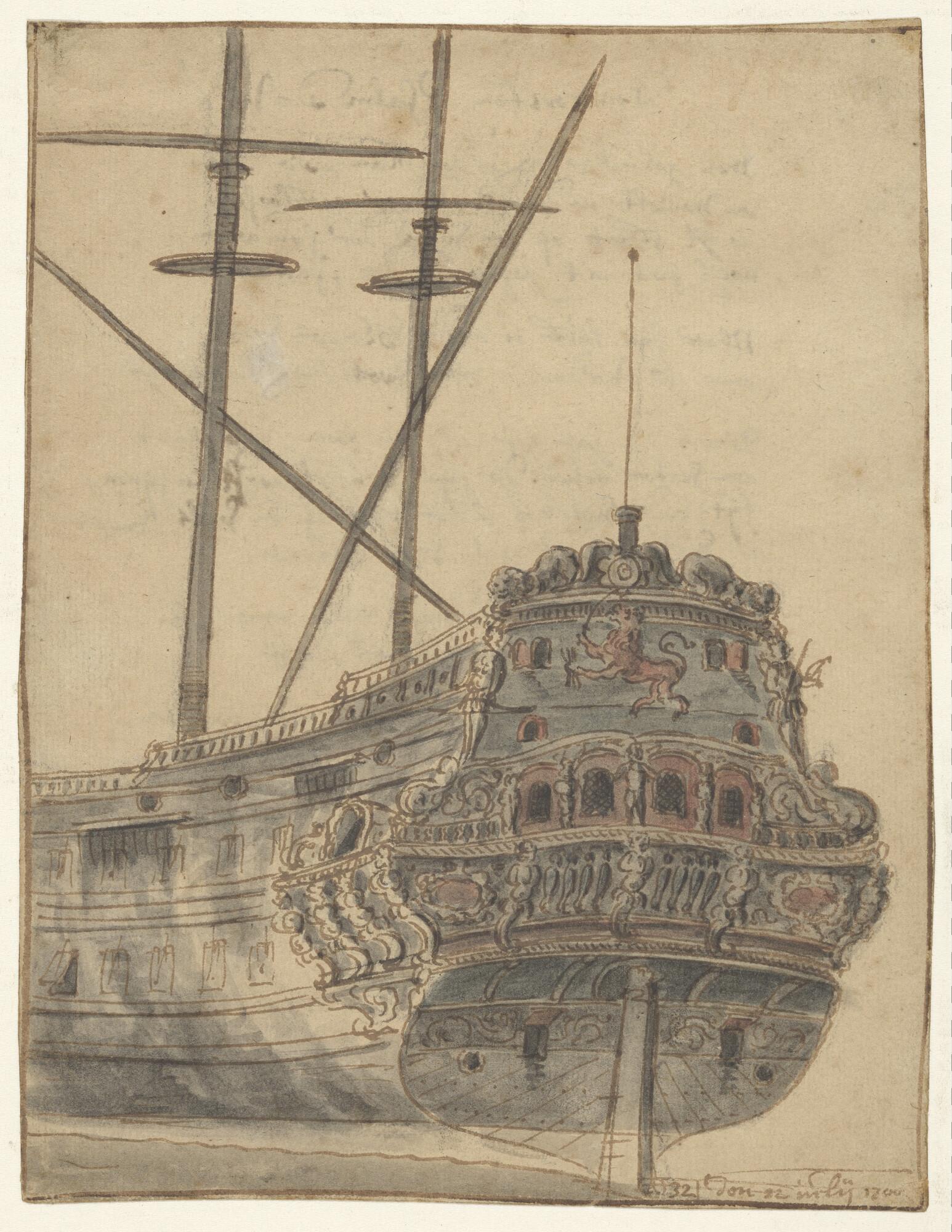 De spiegel van een oorlogsschip, versierd met een ro...