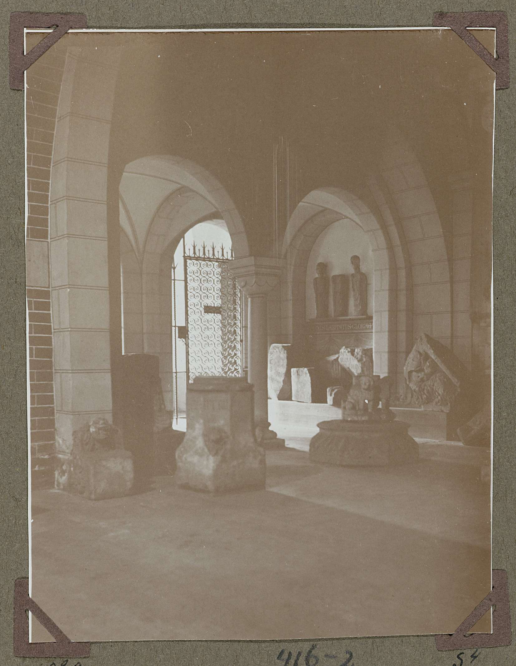 Opstelling van bouwfragmenten in het souterrain in 1929