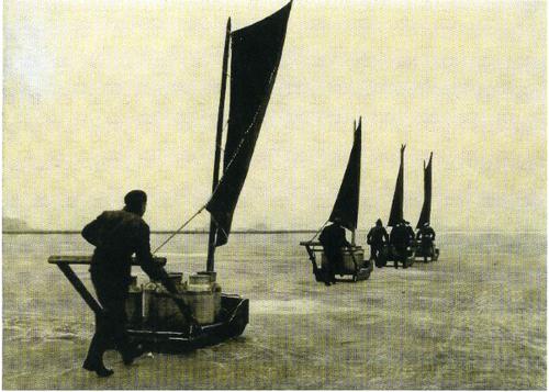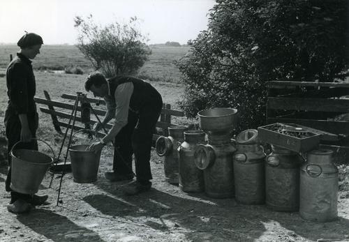 Foto in zwart-wit van het vervoer van melkbussen ove...