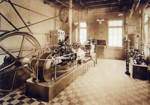 Foto in sepia van de machinekamer van een zuivelfabr...