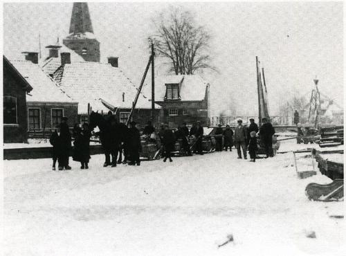 Foto in zwart-wit van een winters dorpsgezicht van W...