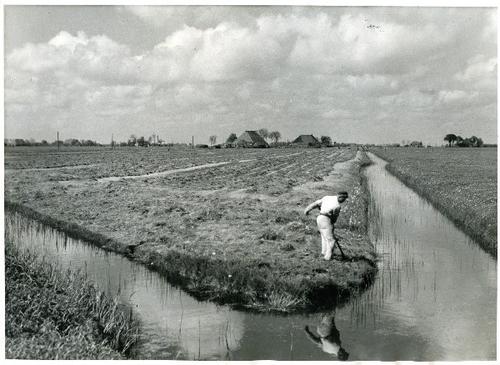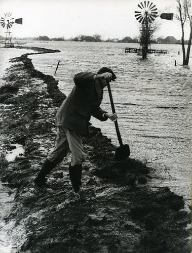 Foto in zwart-wit van het ophogen van kaden bij wate...