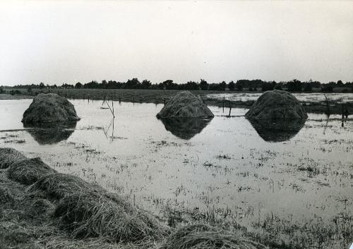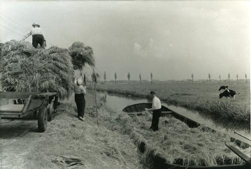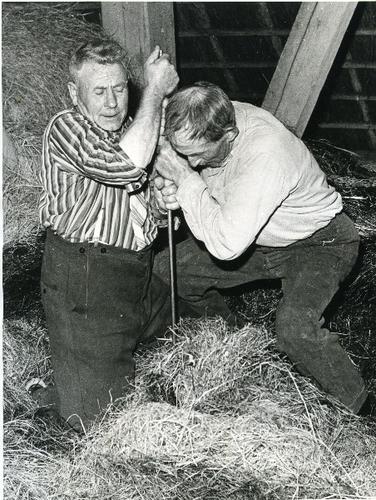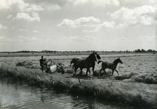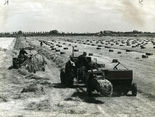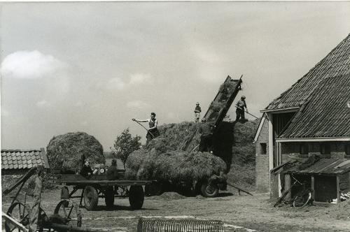 Foto in zwart-wit van het laden van hooi vanuit een ...