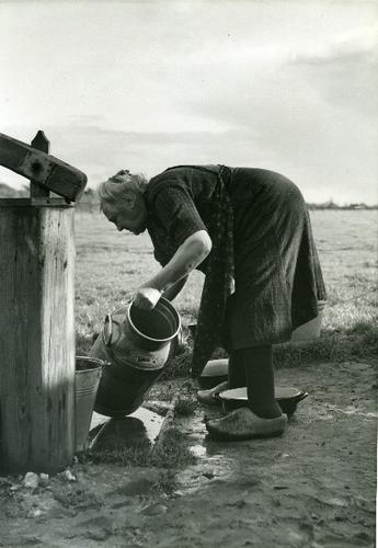 Foto in zwart-wit van een vrouw bij een pomp op een ...
