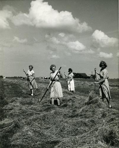 Foto in zwart-wit van vrouwen die hooi harken op een...