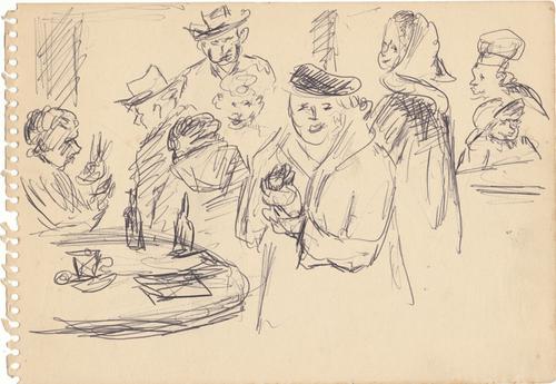 Negen figuren met hoofddeksels bij een tafel