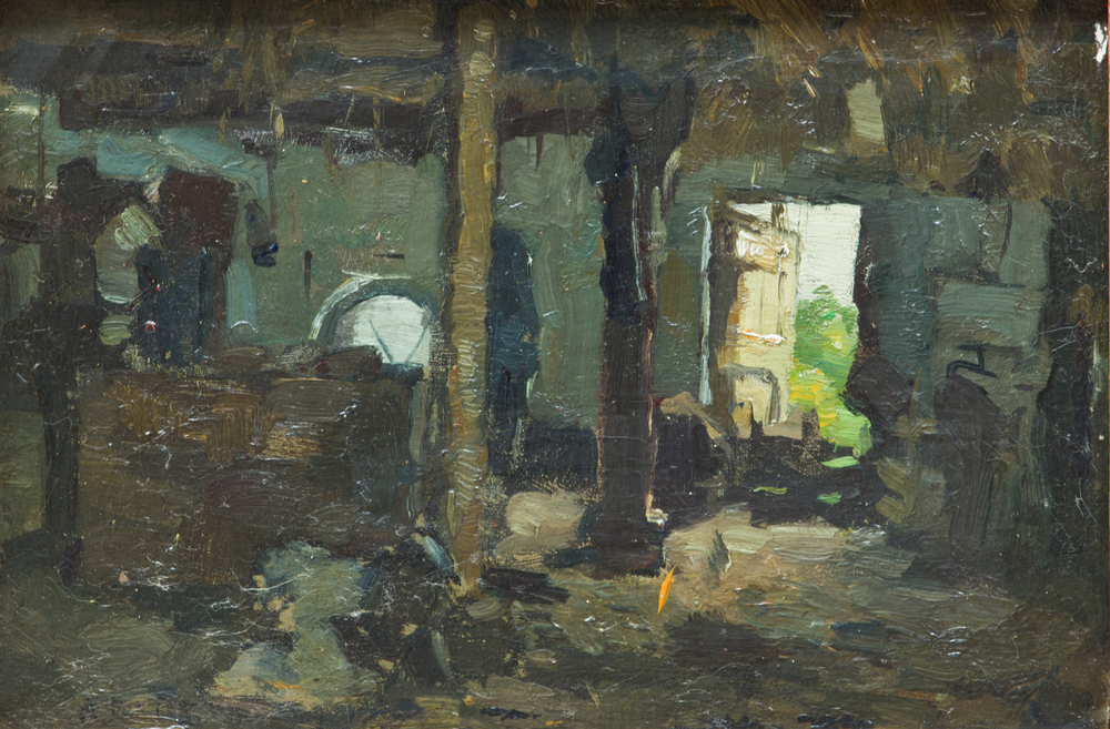 Boereninterieur met vrouw voor de haard