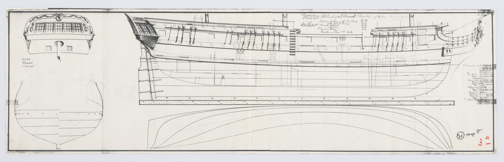 Oorlogsschip Braak: zijaanzicht, verticale langsdoor...