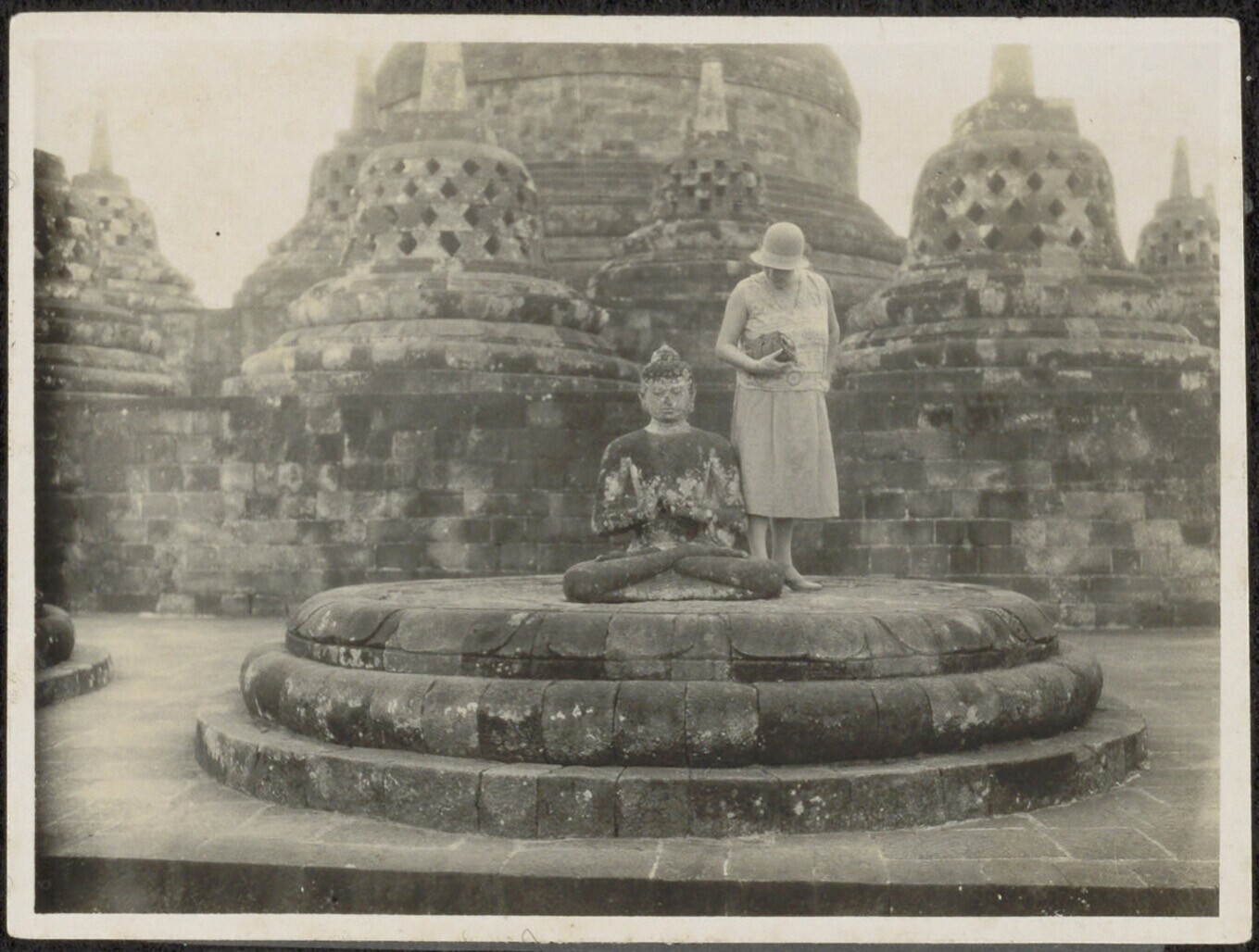 Vrouw naast een Boeddhabeeld op de Borobudur