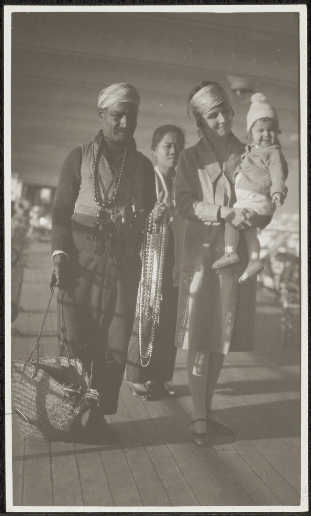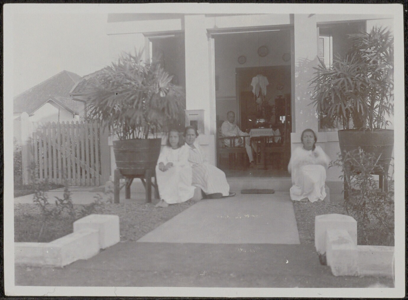 Een vrouw en twee meisjes, zittend voor de voorgalerij
