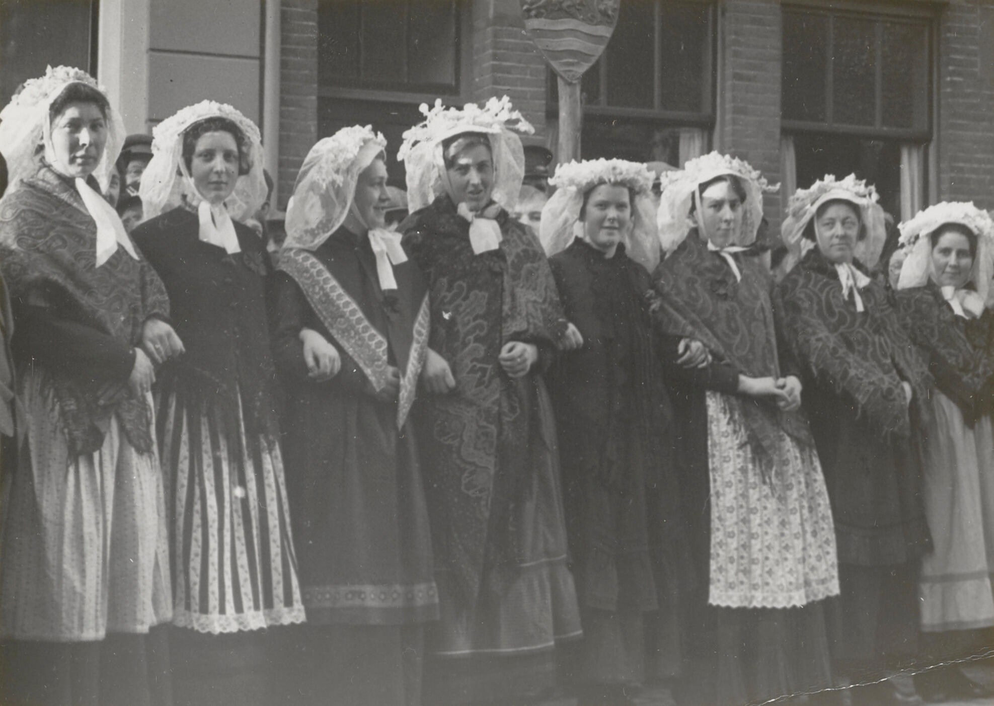 Vrouwen in dracht uit Heusden, 1938 (zwart-wit foto)