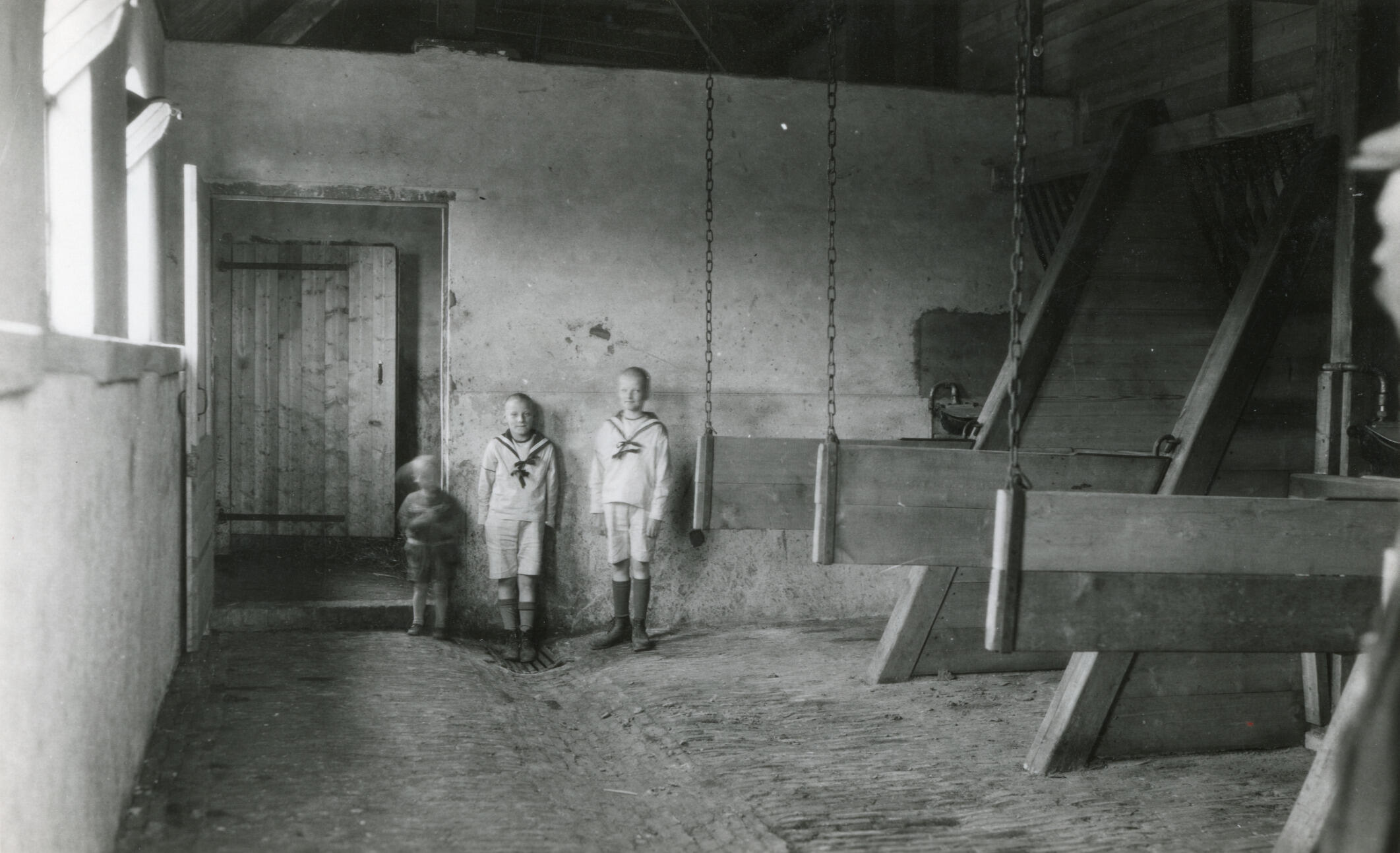 Jongens in een paardenstal, Valburg, 1938 (zwart-wit...